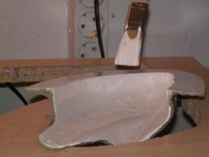 Con el GEL COAT seco pero pegajoso aplicaremos una mano de RESINA POLIESTER COLADAS 9900 - CAT POLIESTER P-200 a 1,5 % o 2 % y acto seguido colocaremos Fibra de vidrio o Tejido aconsejo uno de poco gramaje, para poder moldearlo bien .