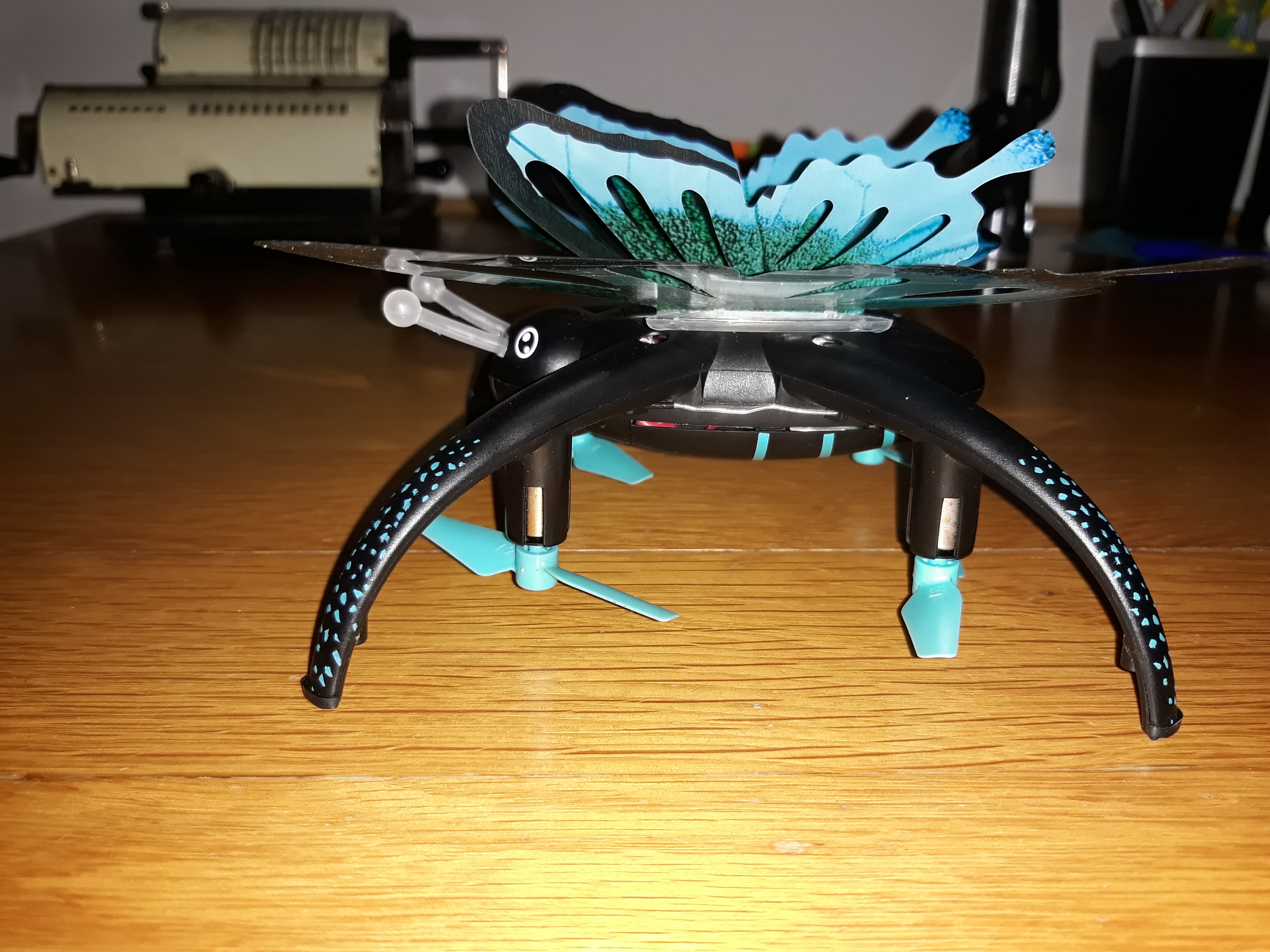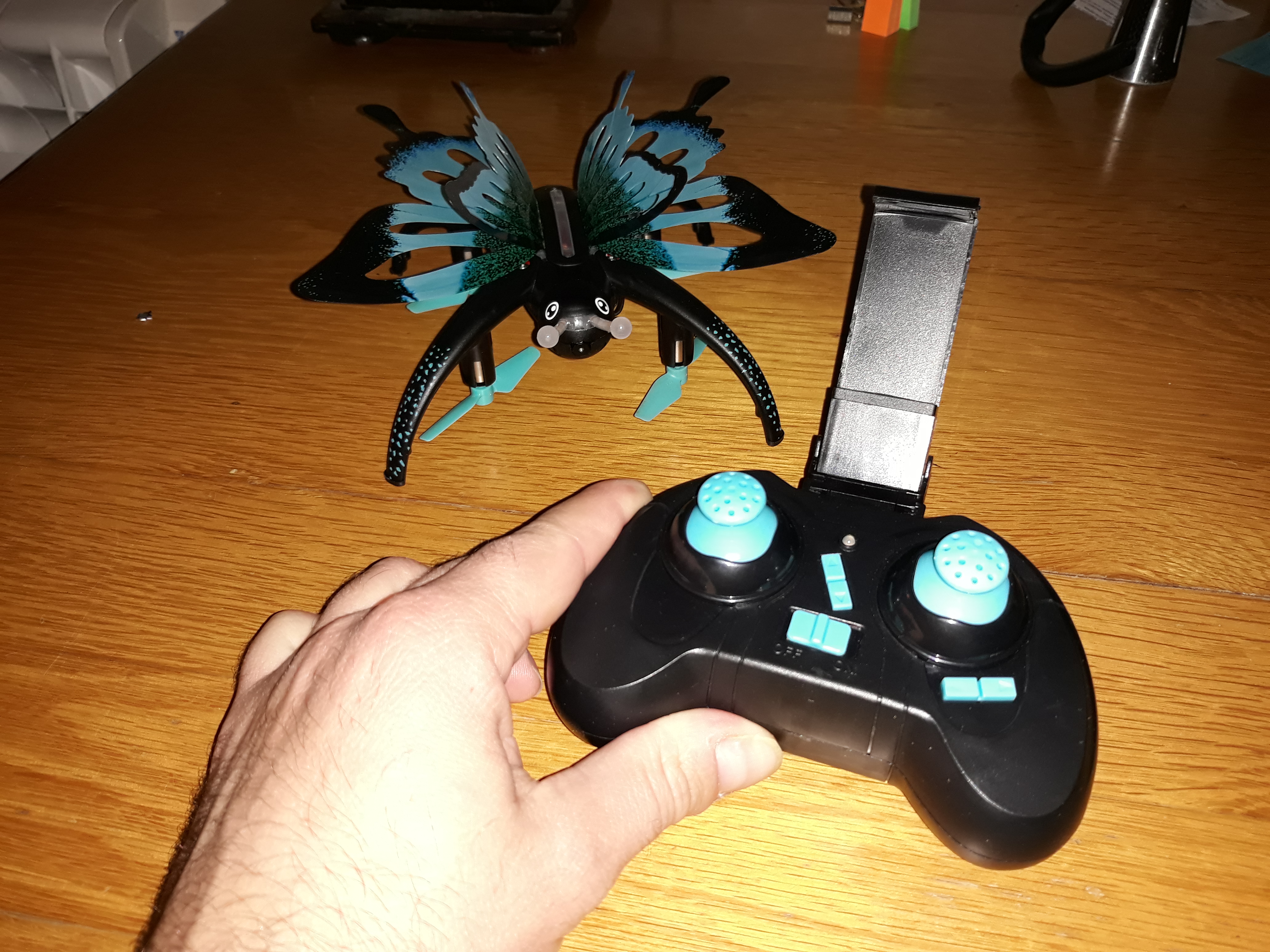 El “Butterfly rc drone H42 2.4G RC Wifi FPV” es un microdrone tipo quadcopter con forma de mariposa que cuenta con un cuerpo de plástico duro y por lo que hemos probado bastante robusto. Una de sus características más exclusivas es la colocación de los motores, al contrario que la mayoría están invertidos, y a su vez protegidos por las patas de la mariposa que los rebasan por el exterior como protección. De esta forma evitan los típicos protectores radiales que se ven en la mayoría de los drones de este tipo.