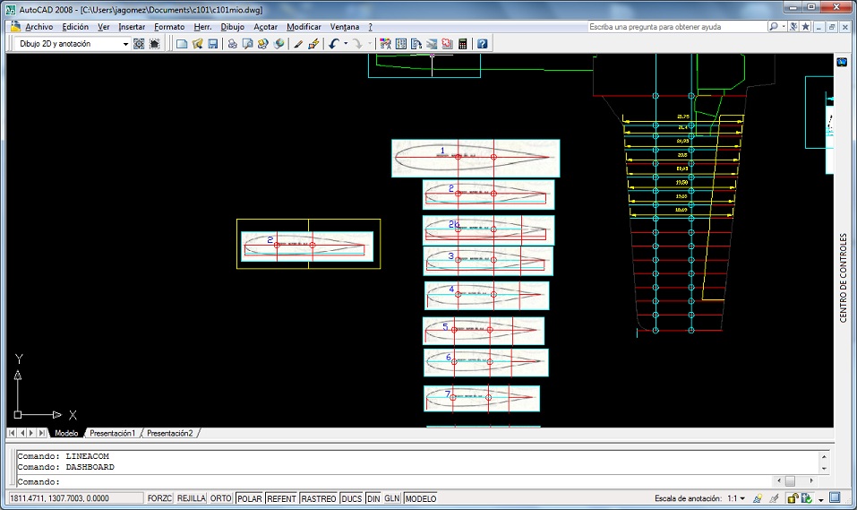 2.- Las sacamos directamente a 1:5, anoche escale a la longitud de 12,25 m (conservo el original, pero la longitud de este original es 15,172 m).