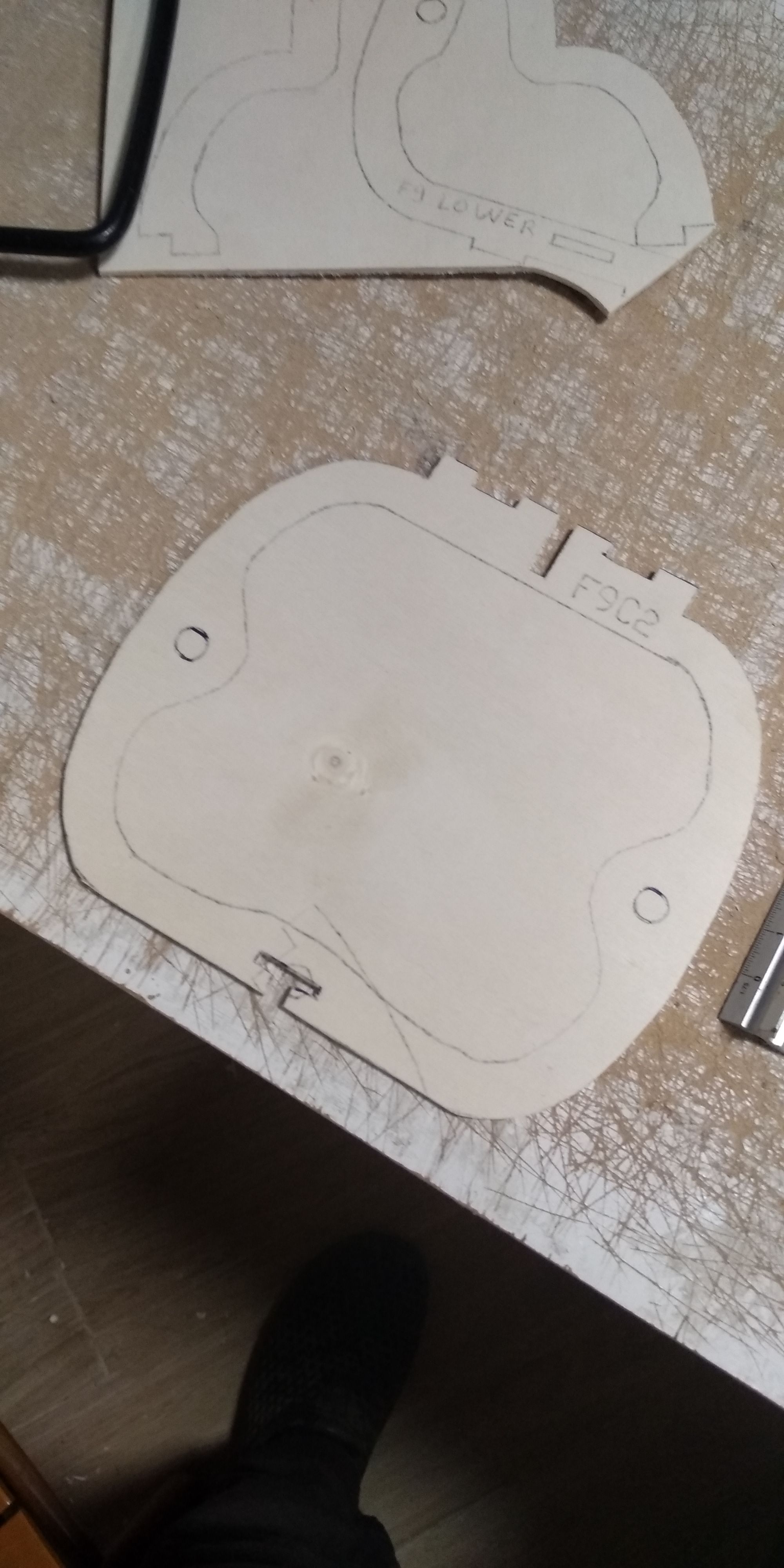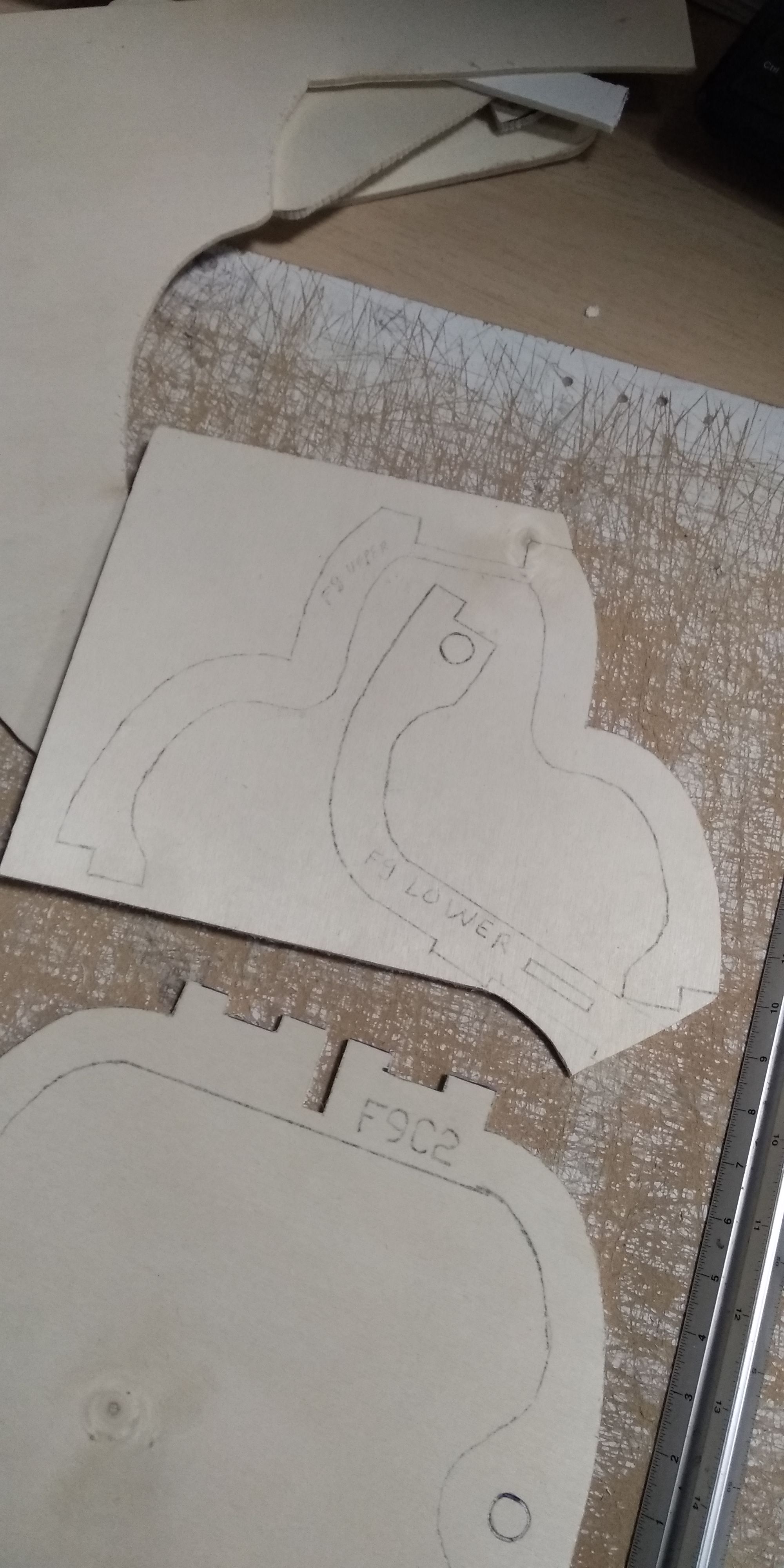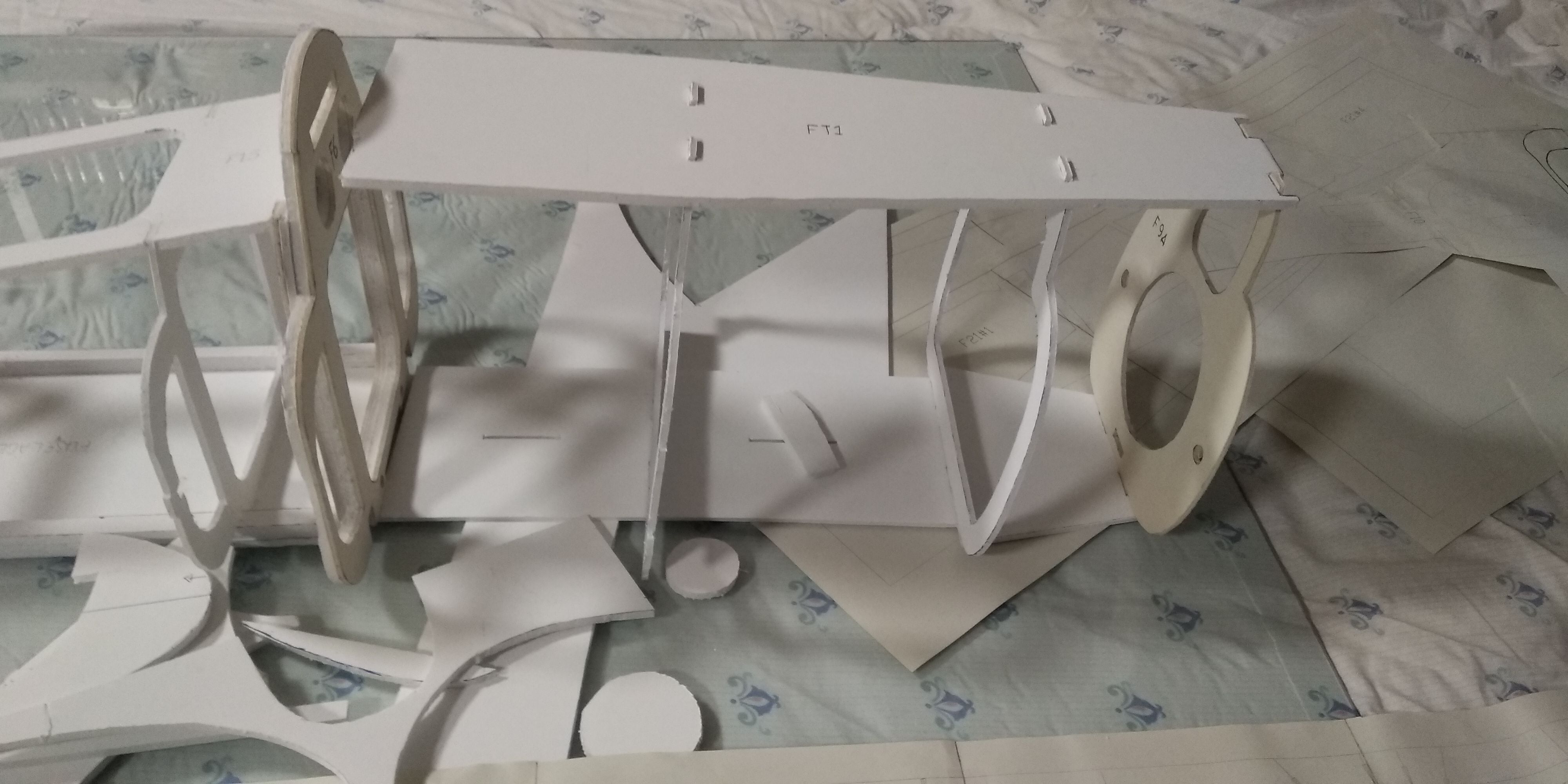 Tras detectar que el cartón pluma de 5 mm para algunas piezas es muy inconsistente, decidí hacer las piezas en contrachapado de 3 mm ( tablerillo del barato para trabajos manuales) (tambien sirve la madera de cajas de fruta), algunas de las piezas las hice dobles.