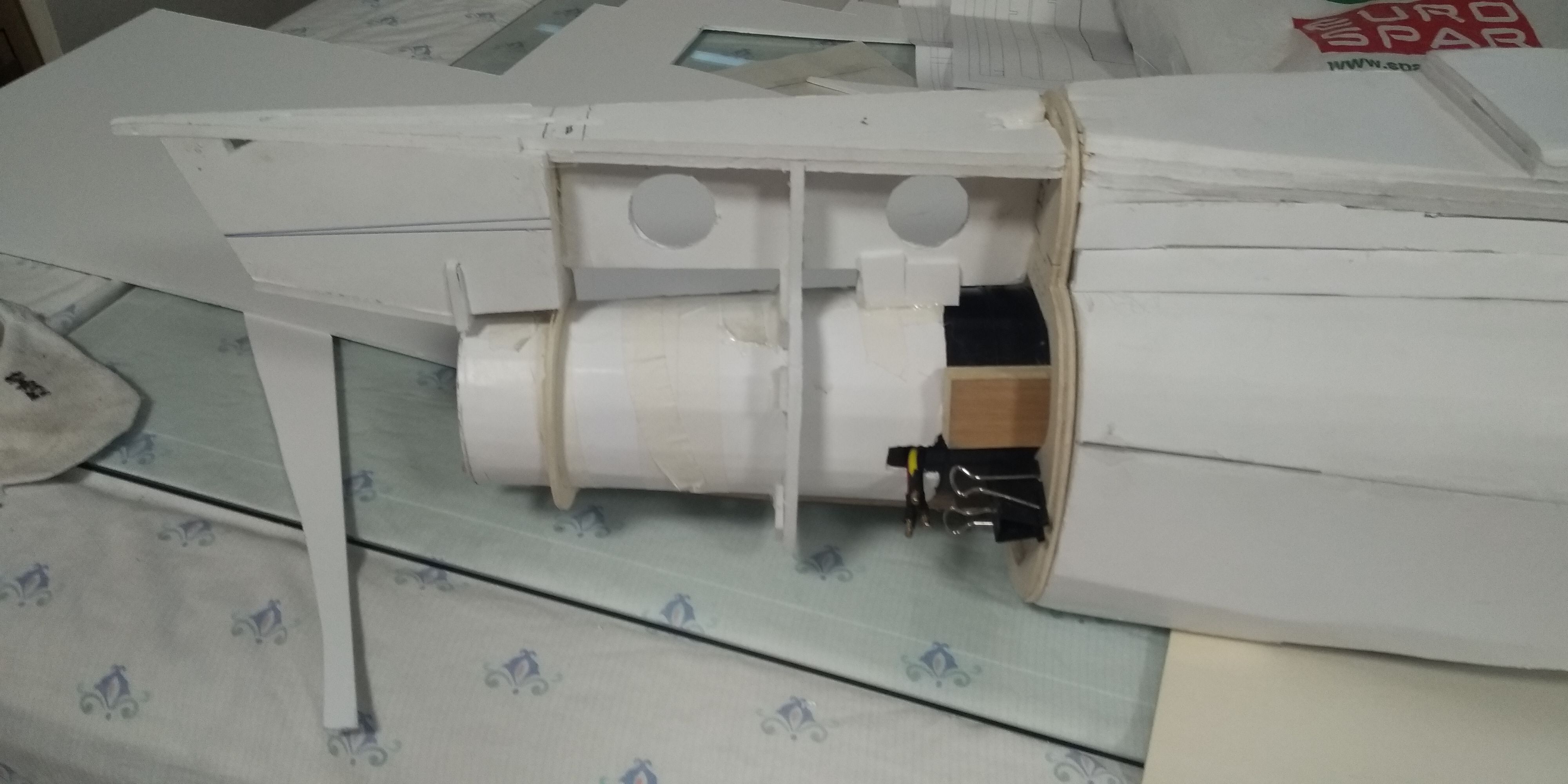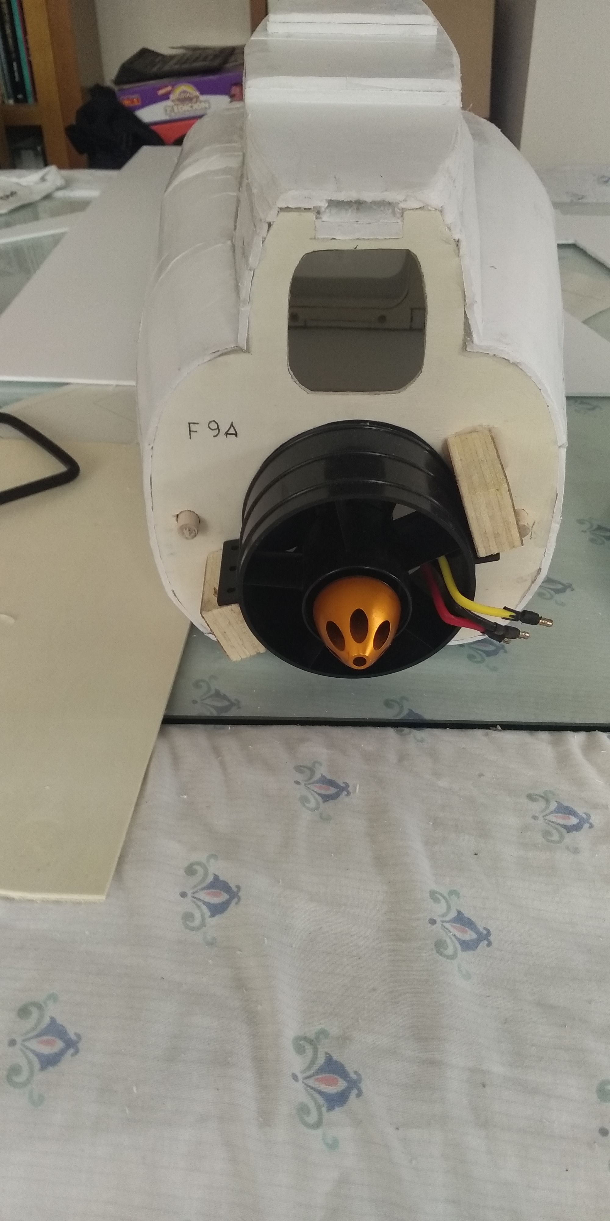 Ya pude colocar la edf a ver como quedaba y forrar el tubo de salida y la parte de la cola, aun queda poner el timón y el estabilizador , pero bueno eso es mas lento.