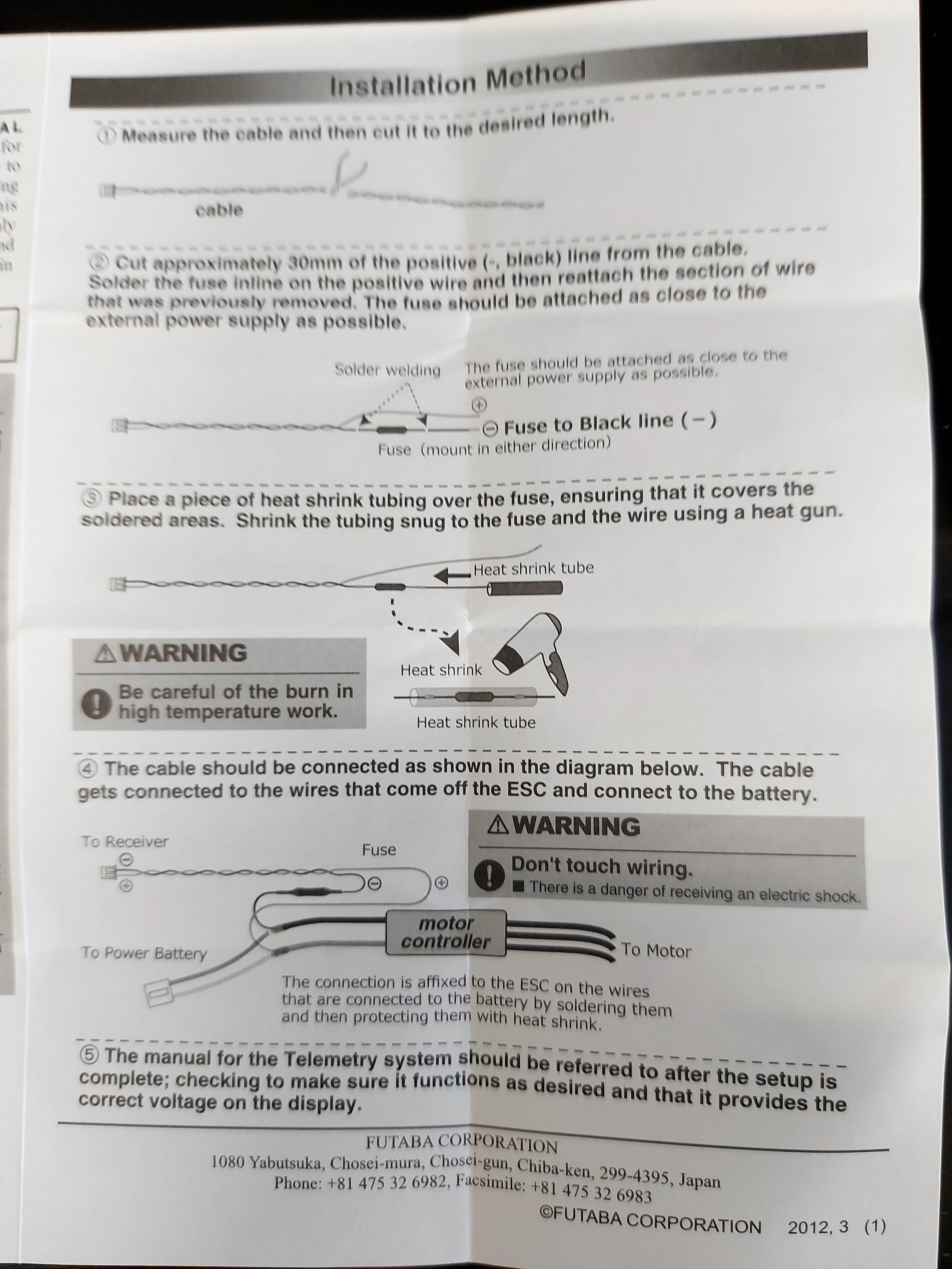 Para saber mediante telemetría el estado de la batería externa de un motoplaneador, he comprado un cable Futaba CA-RVIN-700. Hay que soldar un fusible en uno de los cables (positivo? / negativo?). En el texto de las instrucciones indica que este fusible se debe colocar en el cable POSITIVO. Por el contrario, en las imágenes que acompañan a dichas instrucciones, dice que debe soldarse en el NEGATIVO.