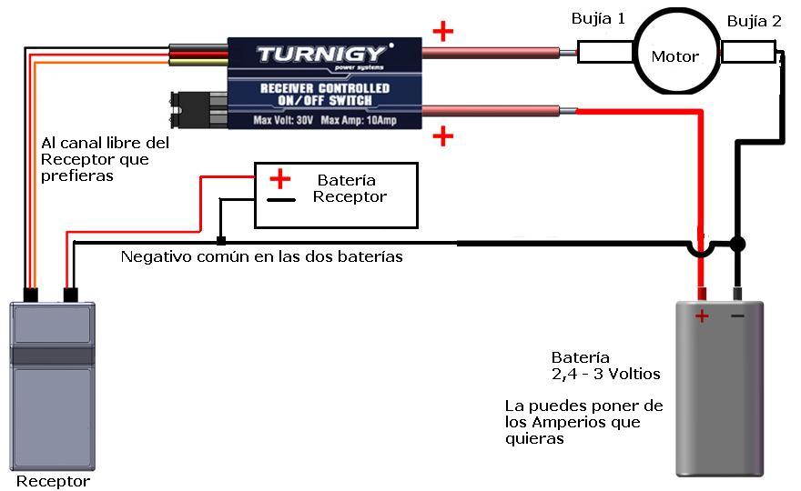 El punto de gas a partir del cual se apaga la bujía se puede regular con un potenciometro, y cuando apagas el receptor, se apaga la bujía. Esto es importante si la batería y su conector la llevamos en un lugar poco accesible, para evitar accidentes. Yo lo tengo con un paquete de 2 baterias antiguas de NiCd de 1400 mAh en paralelo.