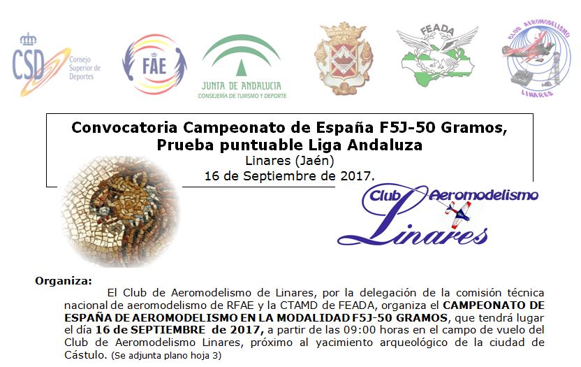 El Club de Aeromodelismo de Linares, por delegación de la comisión técnica nacional de aeromodelismo de la Real Federación Aeronáutica Española (RFAE), organizó el CAMPEONATO DE ESPAÑA DE AEROMODELISMO EN LA MODALIDAD F5J-50 GRAMOS, el pasado día 16 de SEPTIEMBRE, en el campo de vuelo del Club de Aeromodelismo Linares, próximo al yacimiento arqueológico de la ciudad de Cástulo. De forma paralela a dicho Campeonato, se celebrará la prueba puntuable de la Liga Andaluza de F5J – 50 gramos, organizada por la Comisión Técnica de Aeromodelismo de la Federación Andaluza de los Deportes Aéreos (FEADA).