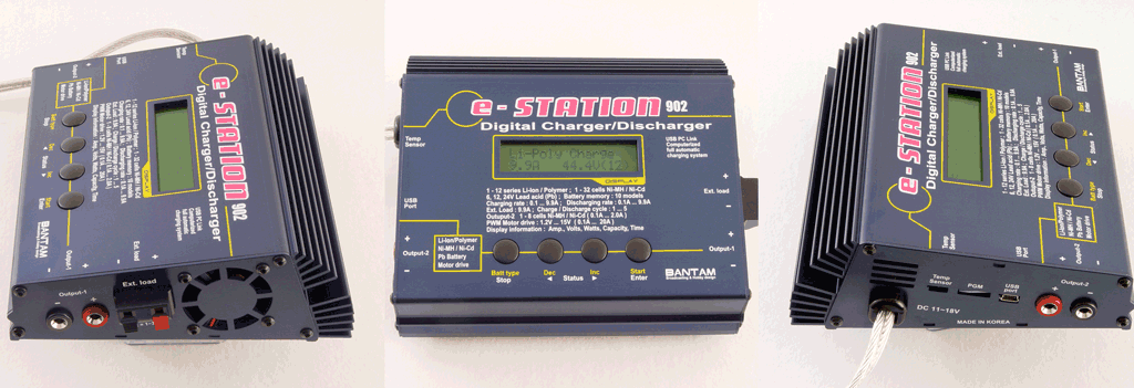 902 tiene 2 salidas de carga,sensor temperatura ,puerto usb, variador de velocidad de 20Amp y 12 lipos 9,9 Amp de carga