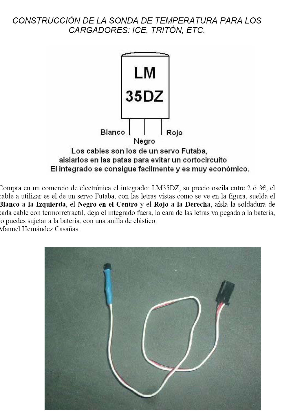 La figura de la página anterior la hice yo, solo vale para los cargadores Ice y Tritón, te adjunto el manual que he traducido a español de la GT Power, vale perfectamente para tu cargador, en la página 21 explico como hacer la sonda para este tipo de cargadores, incluido el tuyo: