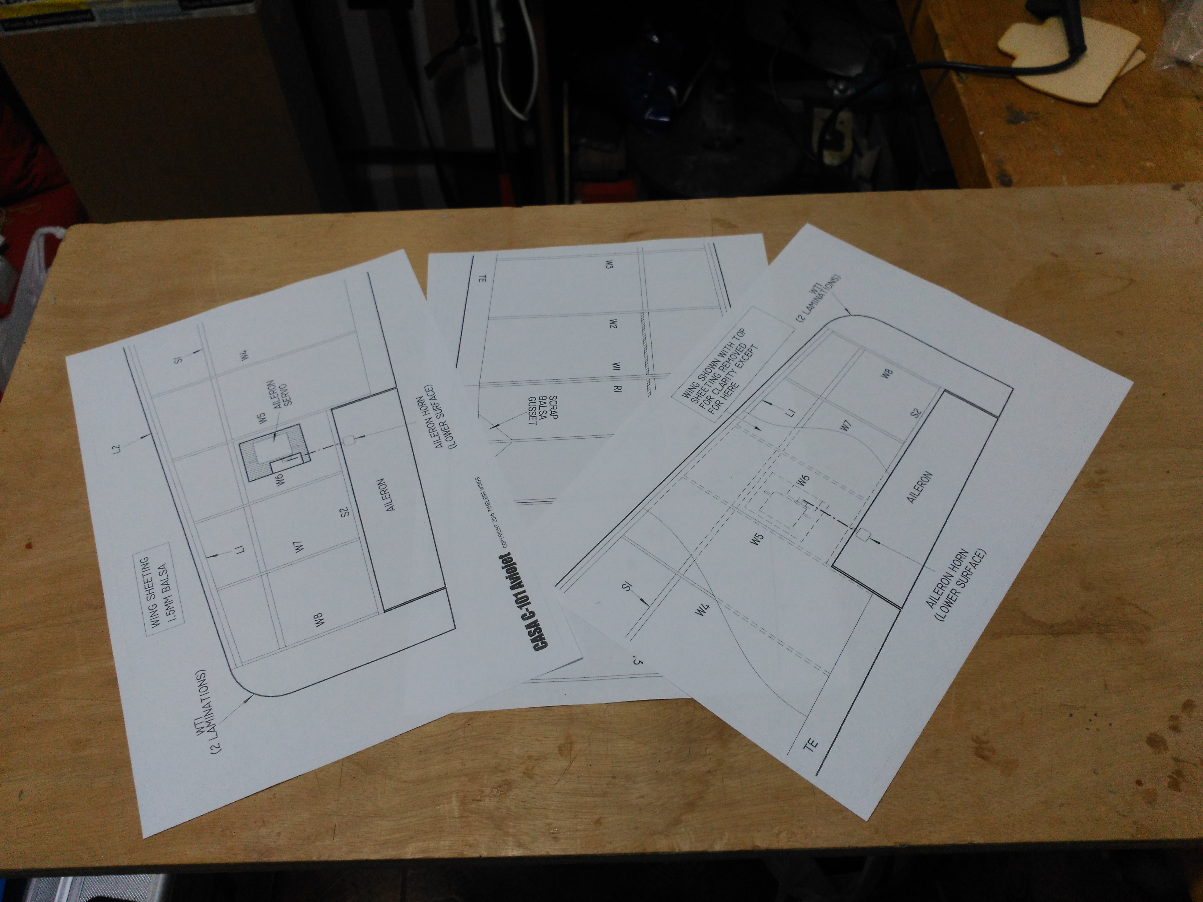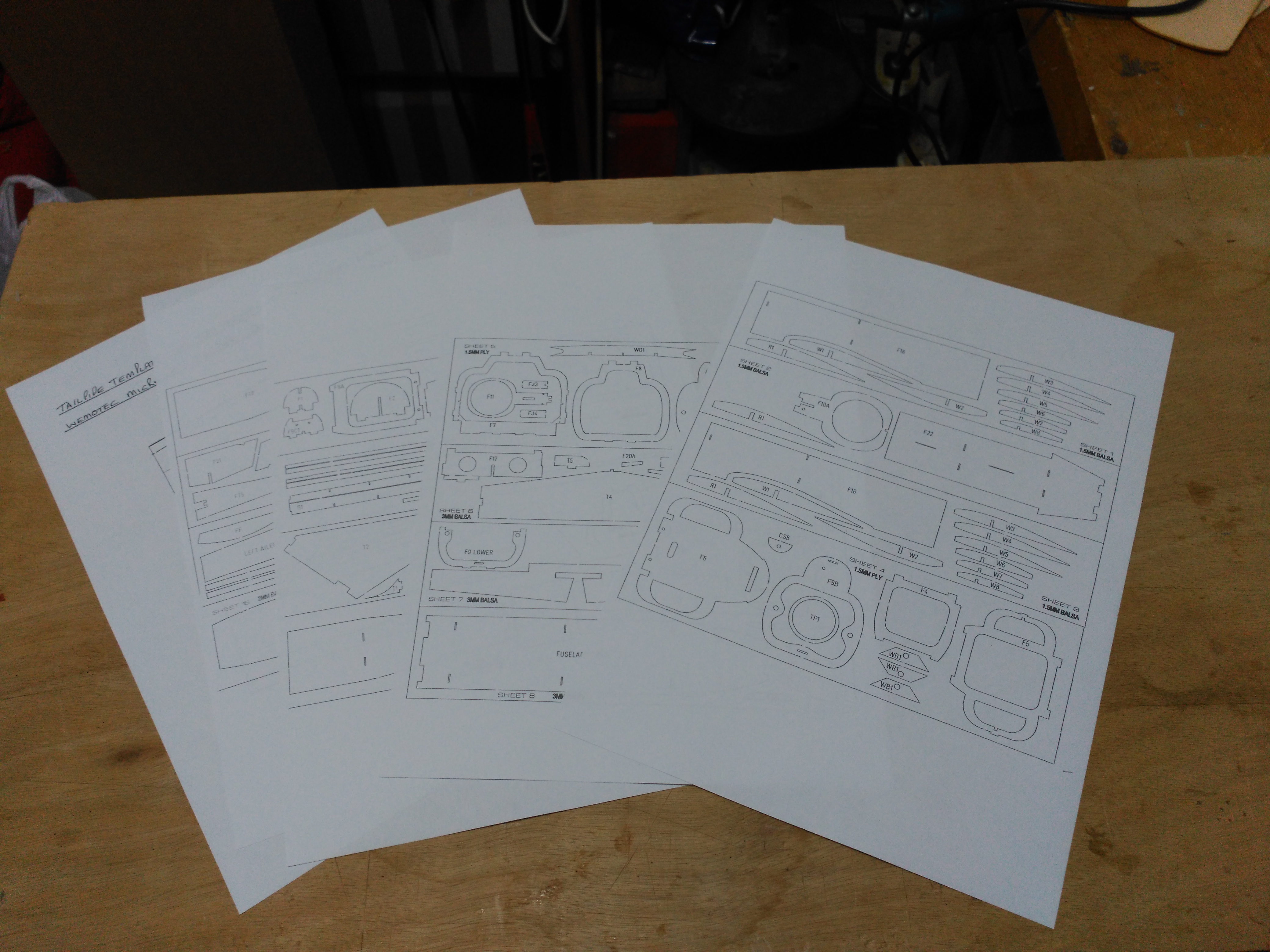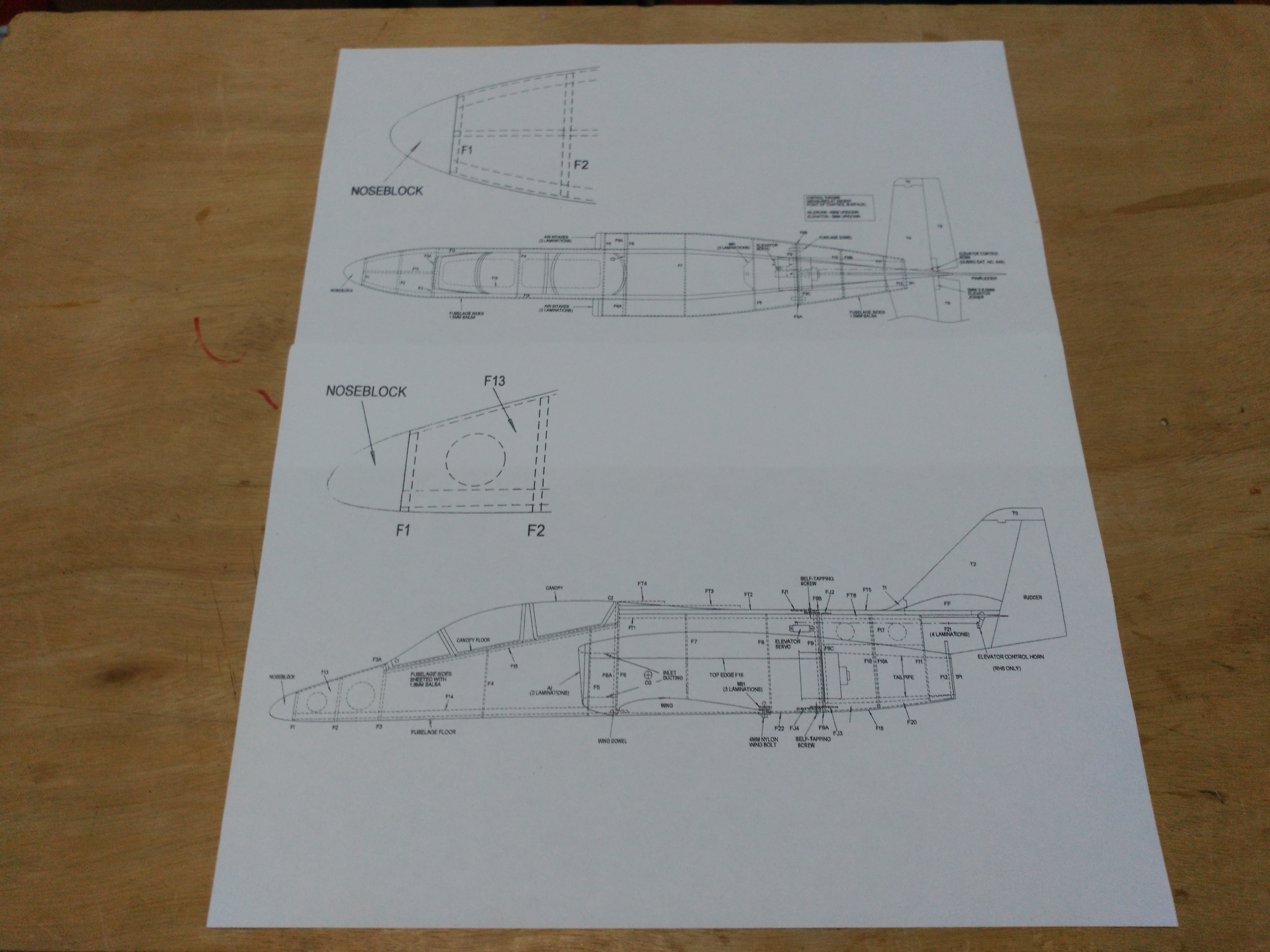 En la documentación del kit incluye en hojas de Din A4 la distribución de las piezas que lo forma numeradas para su identificación, el plano de las alas en tres hojas que tendremos que unir, la planta, perfil del fuselaje y una plantilla para la salida del fan.
