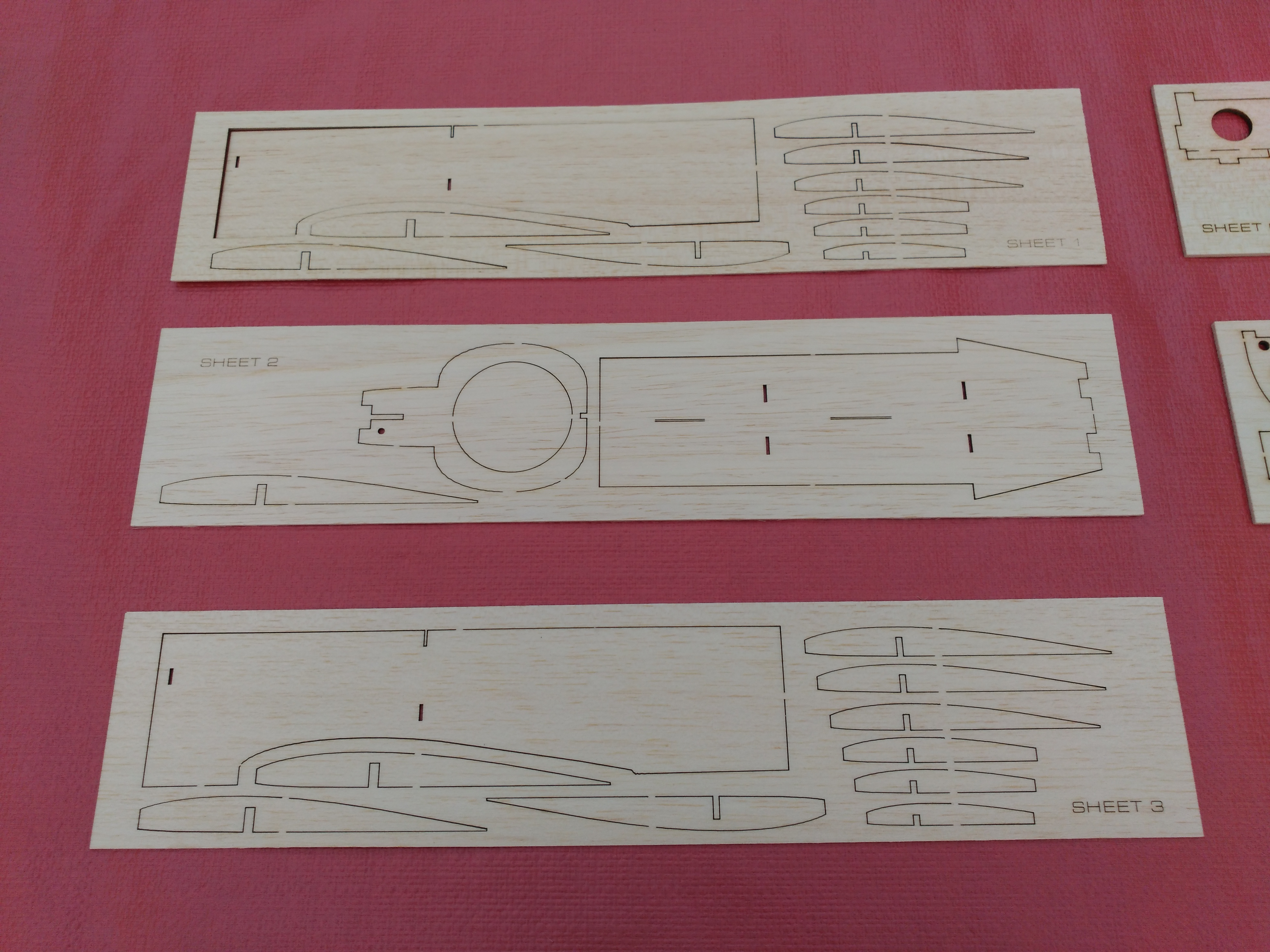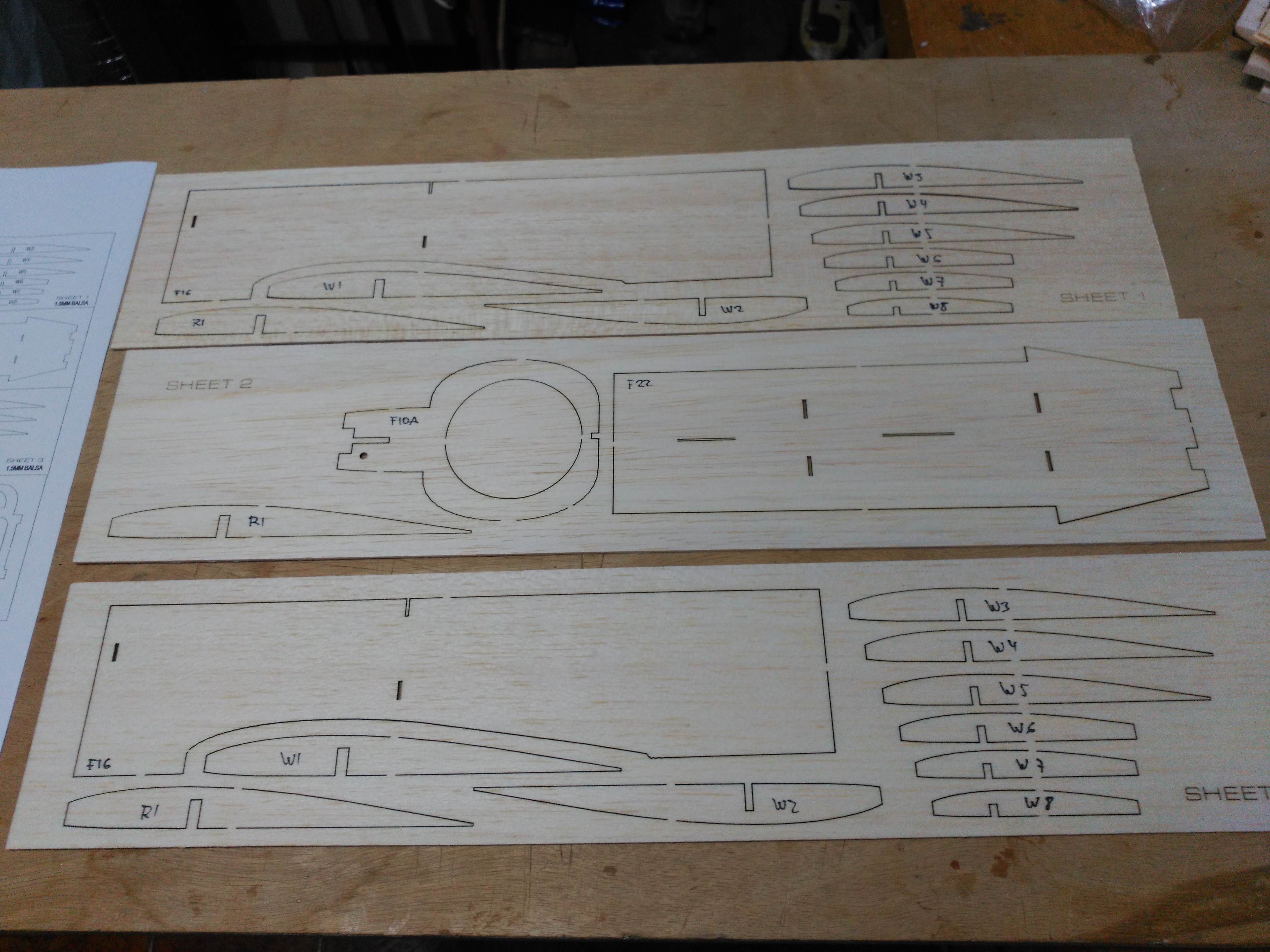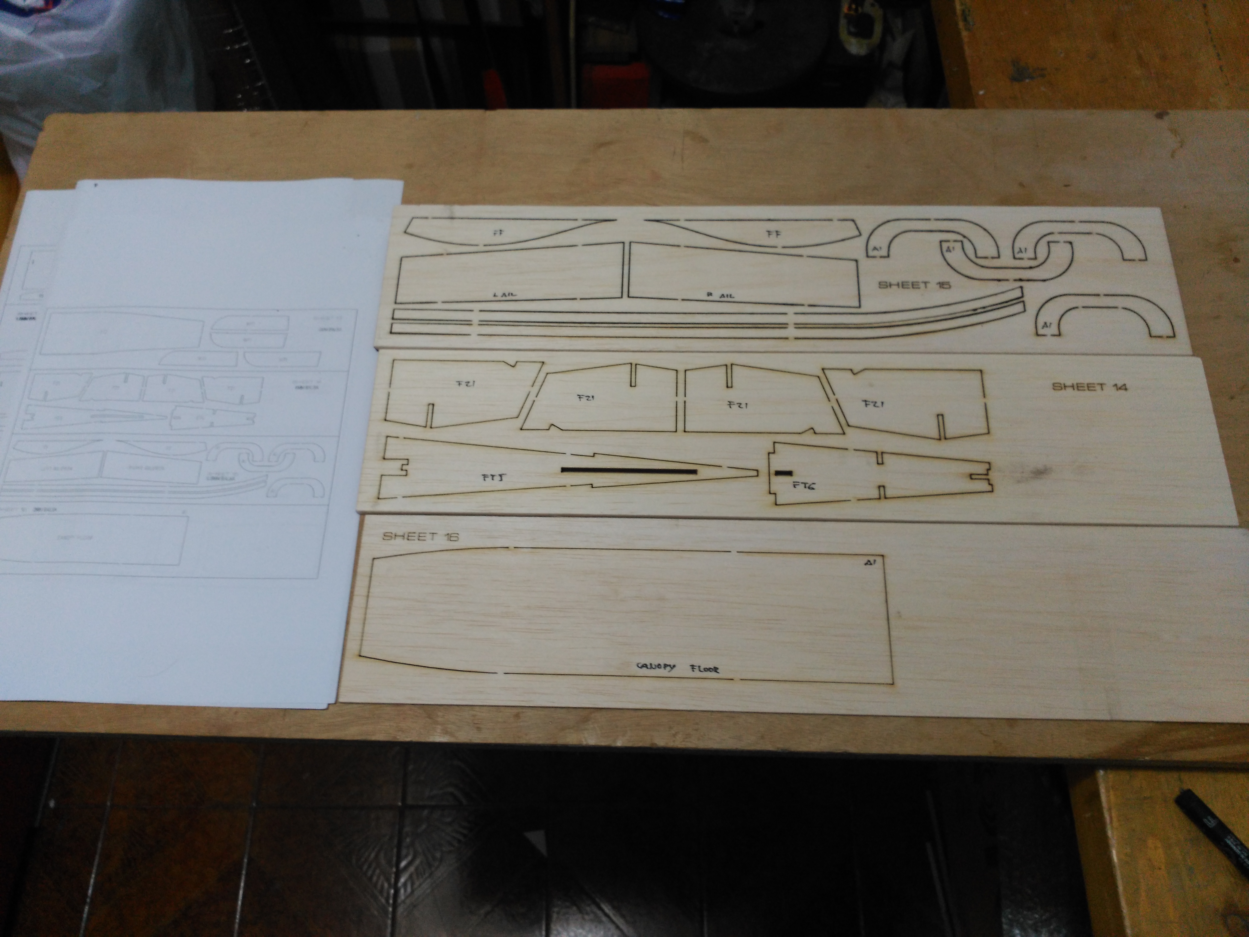 En la documentación del kit incluye en hojas de Din A4 la distribución de las piezas que lo forma numeradas para su identificación, el plano de las alas en tres hojas que tendremos que unir, la planta, perfil del fuselaje y una plantilla para la salida del fan.