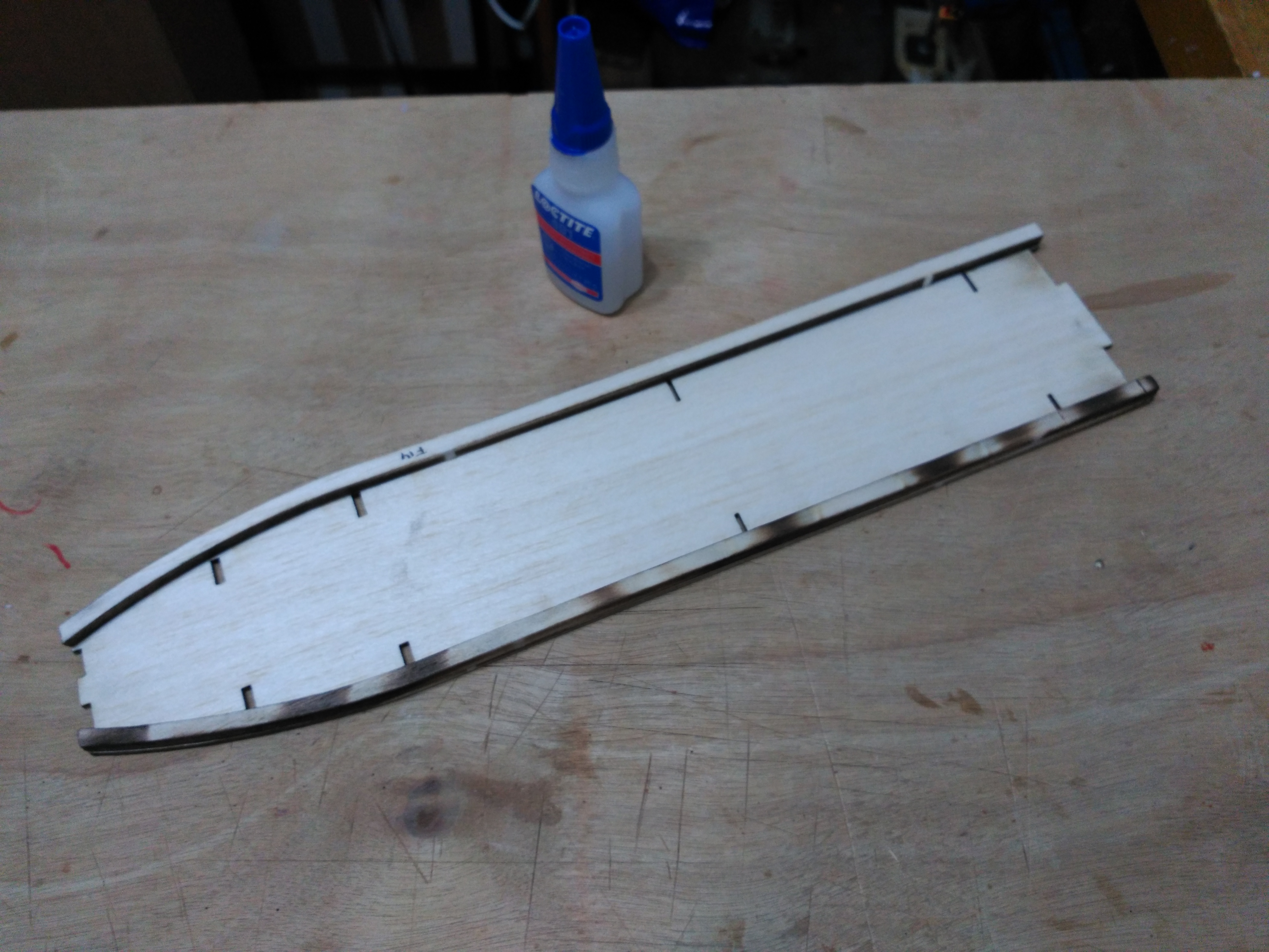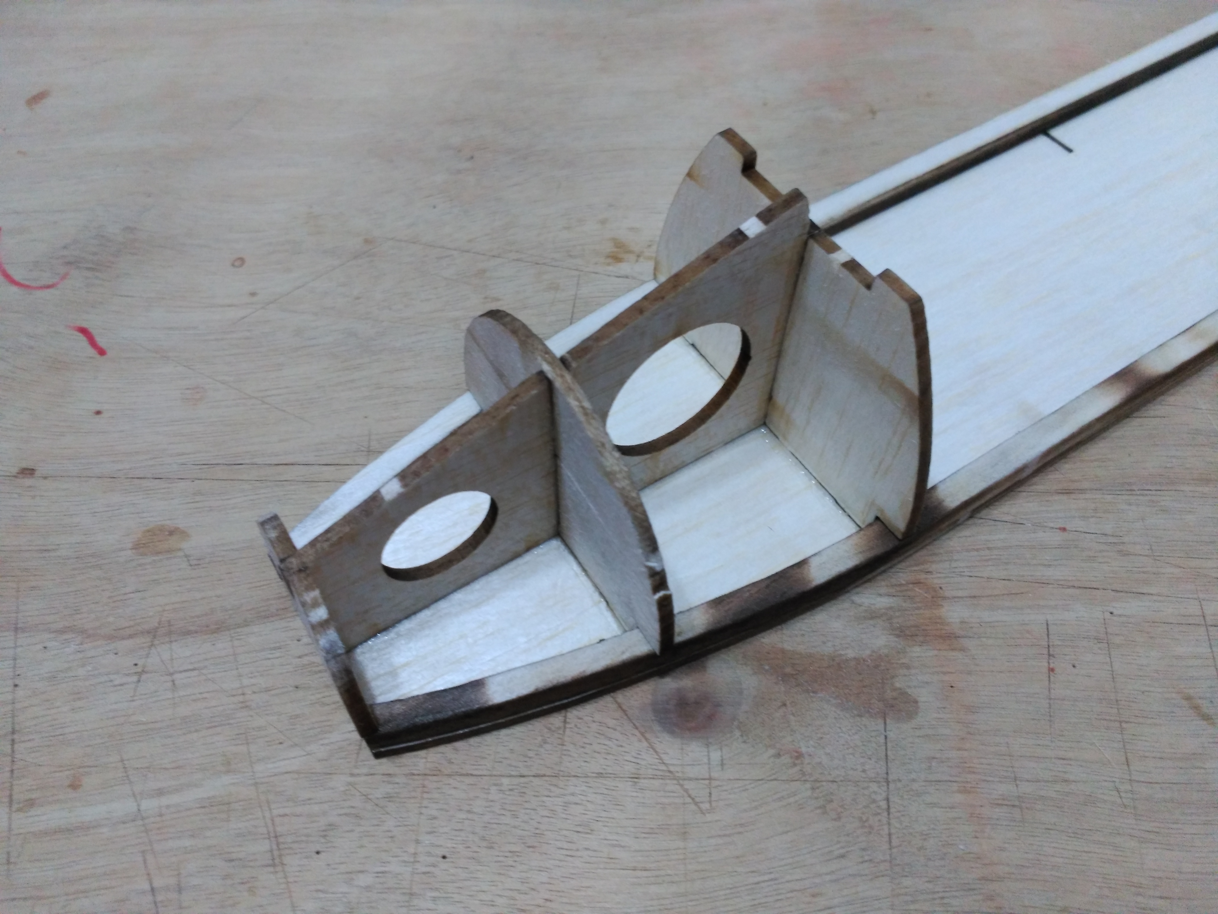 Pegamos con ciano las piezas F14 al suelo del fuselaje, vemos que están un poco ahumadas por el corte por láser pero sin afectar a la forma de las mismas.