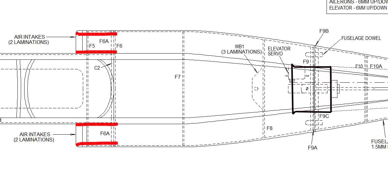 Para colocar las entradas de aire en el fuselaje tenemos que realizar unos cortes de 5 mm en las cuadernas F5 y F6, las marcamos con la ayuda de las misma y las realizamos mediante una lima plana de relojero.