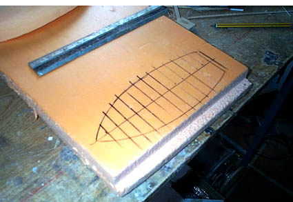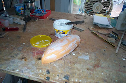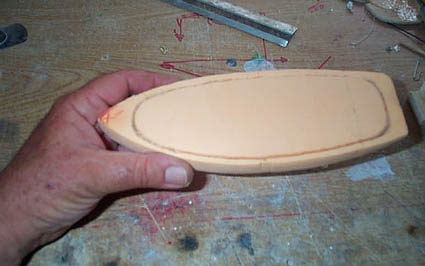 La barquita, con un tamaño real de 20 cms de eslora, la estoy haciendo a molde perdido, sobre bloque de poliestireno de alta densidad, (de 40 mm de grueso) que es más fácil de tallar y lijar, en epoxi reforzado con FV. Pero un delgado estratificado, no hace falta la pared de un blindado.
