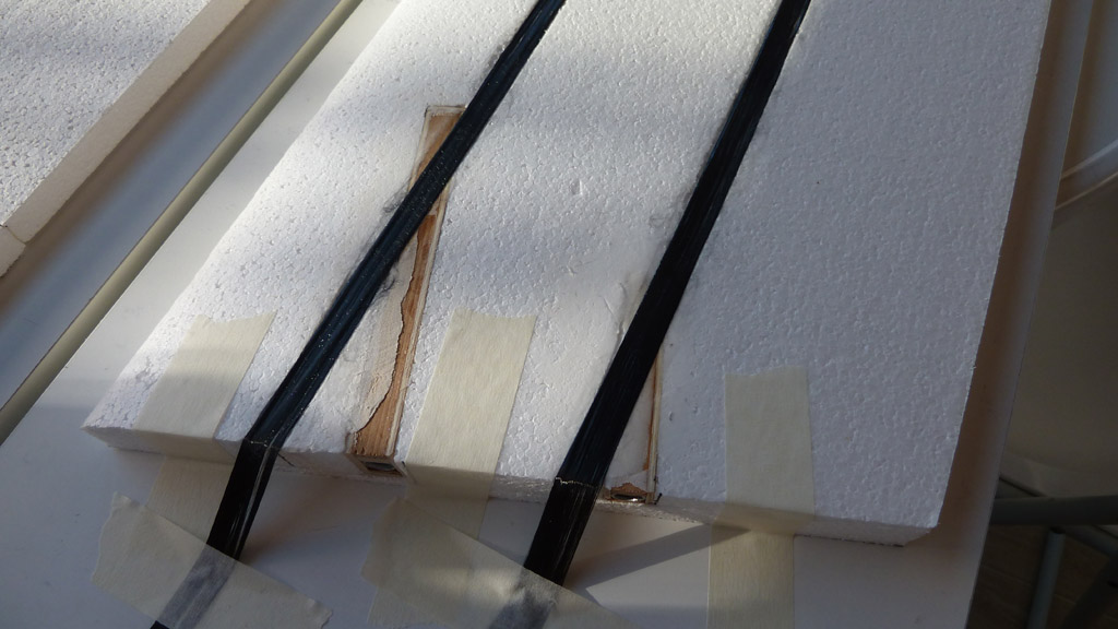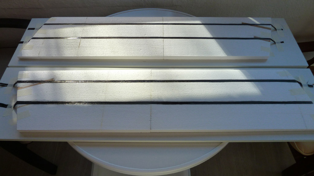 Coloqué dos por el intradós y otros dos por el extradós en mecha de carbono, dándoles resina epoxi de laminar con un pincel.