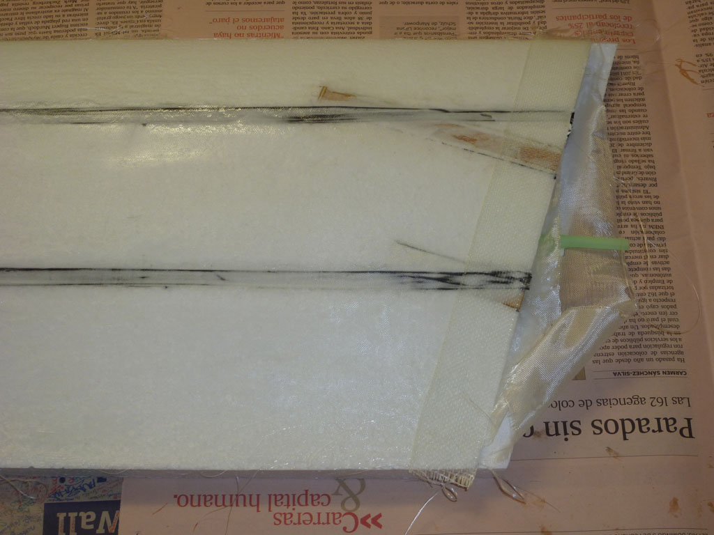 Una vez secos, recubrí el ala con fibra de 50 gramos y refuerzos puntuales en fibra de 100 donde van los tornillos de sujeción al fuselaje, también apliqué resina de lamina con pincel y/o tarjeta de crédito vieja dejándola secar al aire.