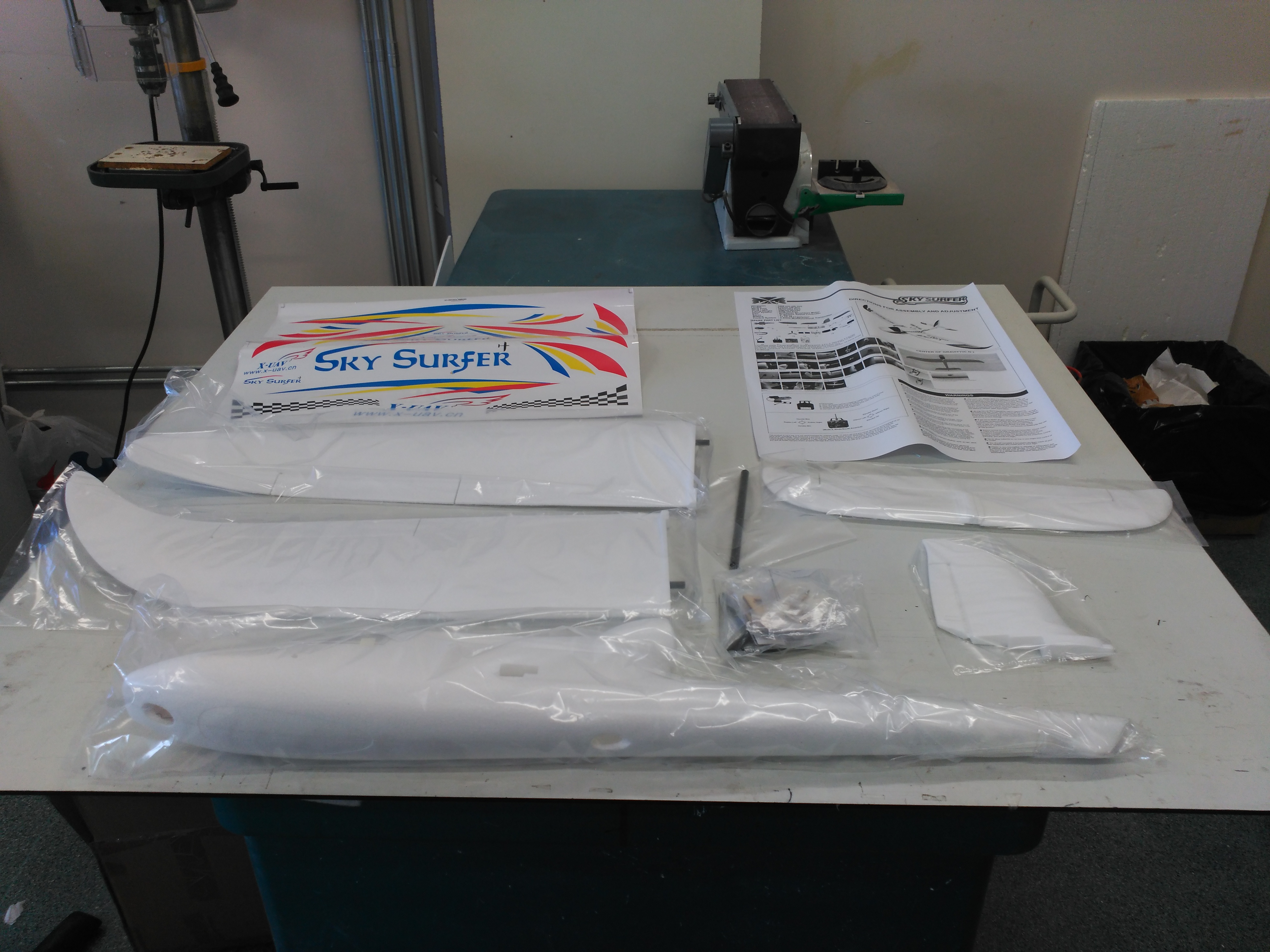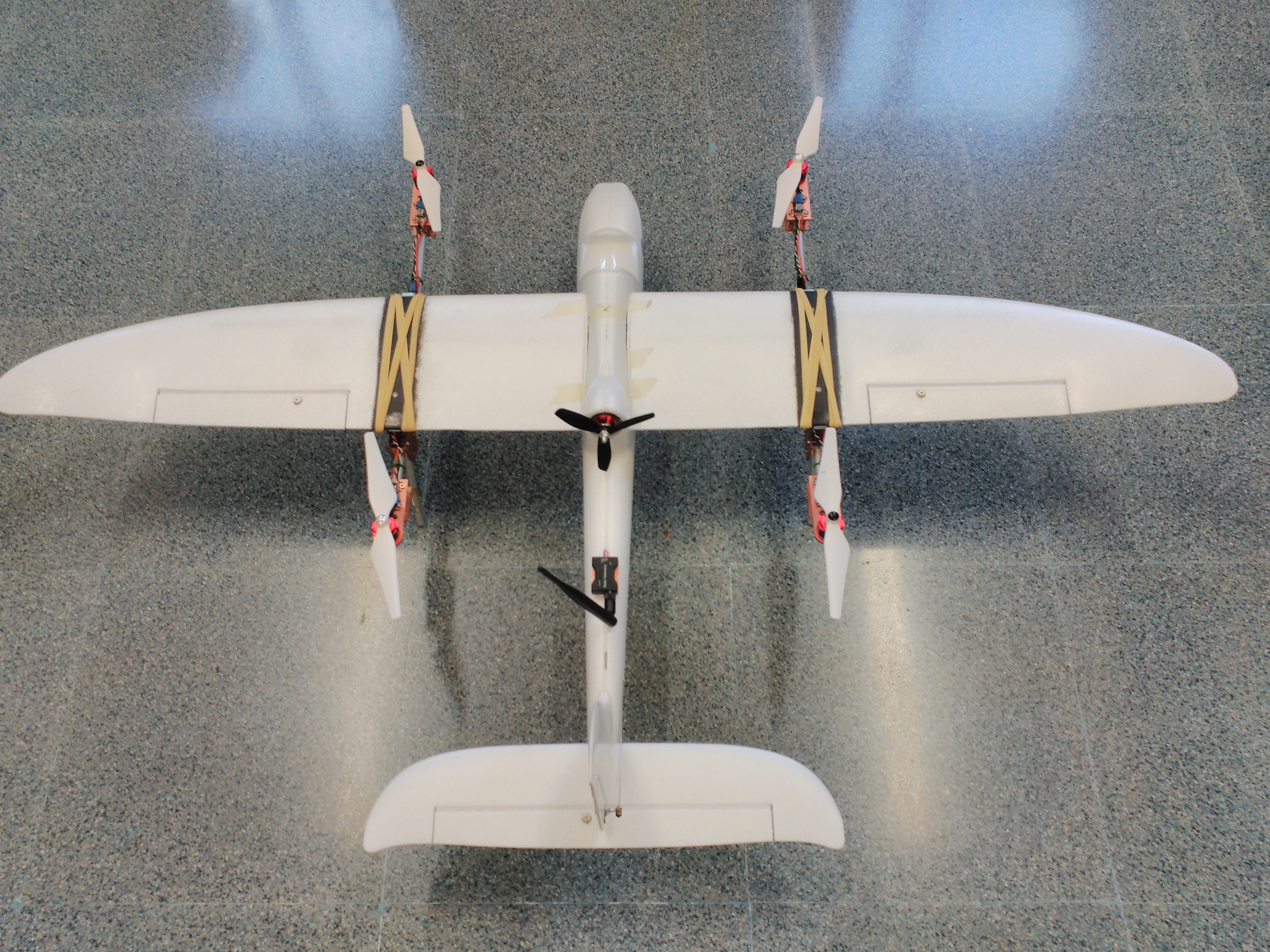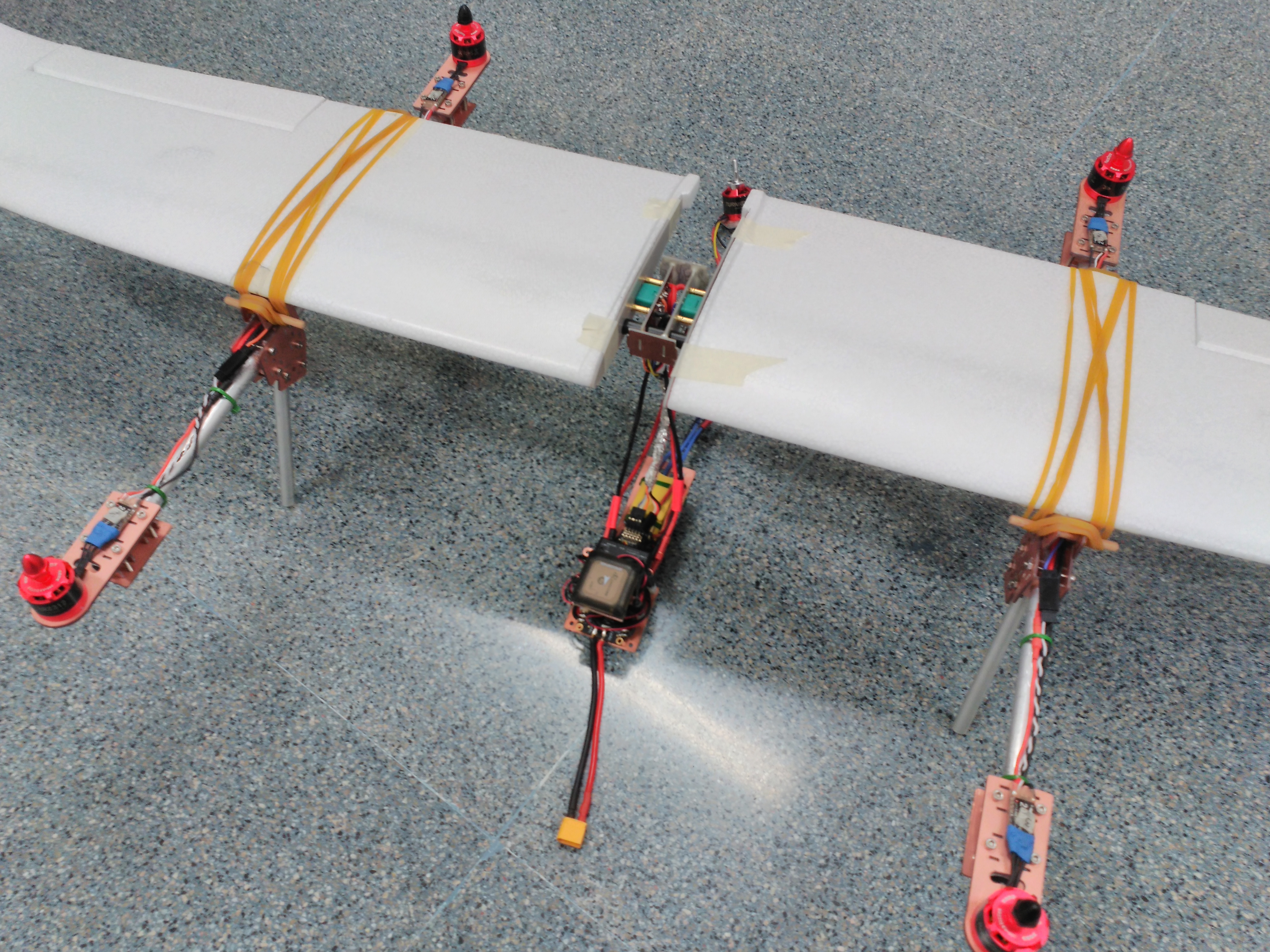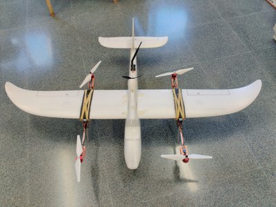 La plataforma de vuelo un SKY SURFER en versión kit. Los motores son un D2826-2000 KV para configuración avión y cuatro BR2312-960 KV para multicóptero.