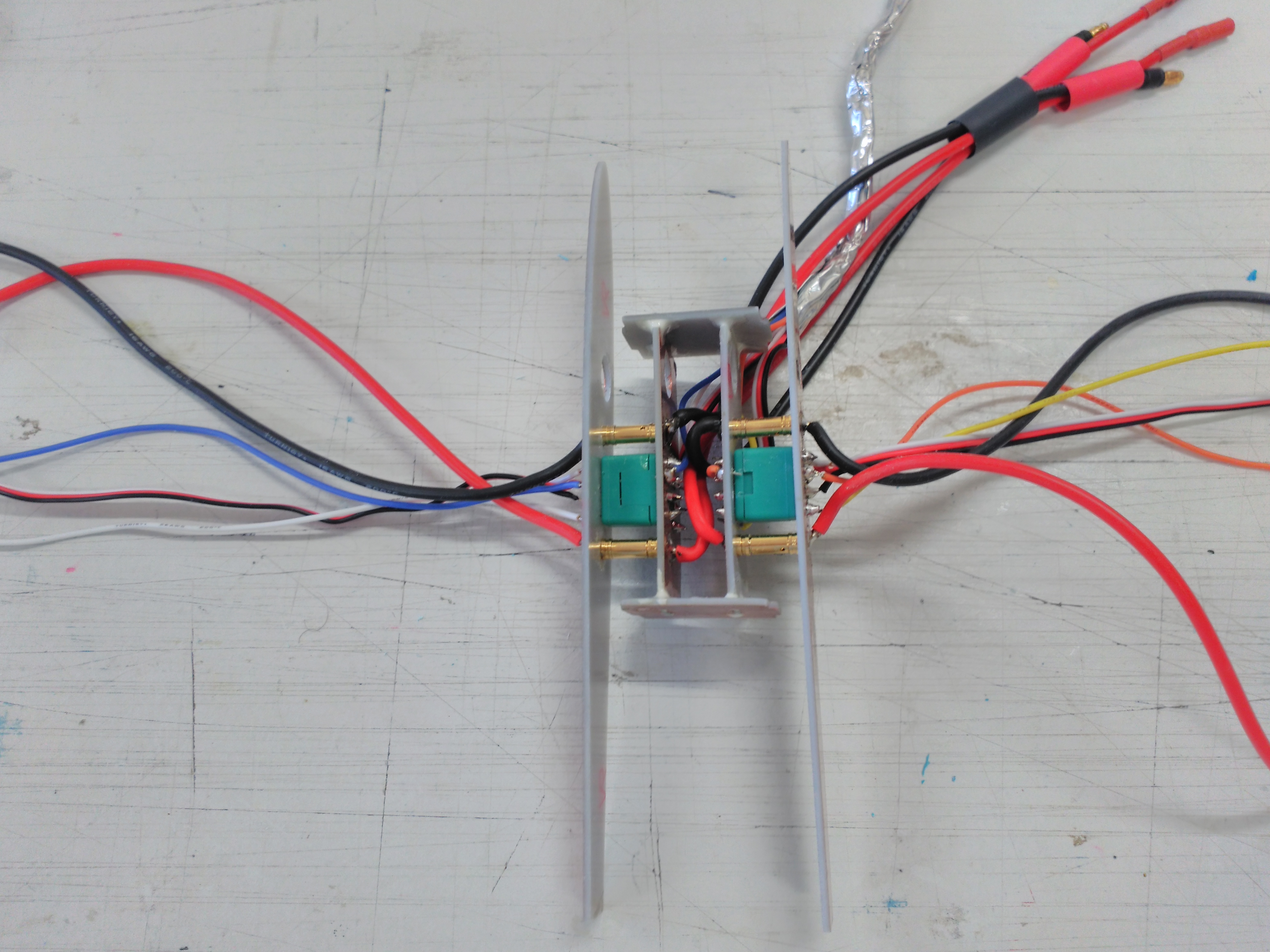 Con esta idea de conector solo nos ha sido necesario sustituir una pieza única pieza del Sky Surfer para llevar acabo este proyecto. Estas son las piezas que hacemos para su sustitución. Por la parte de exterior del fuselaje realizamos una costilla que irá pegada al ala. La conexión eléctrica entre la parte interna del fuselaje al ala queda así. Soldamos todos los cables que nos llevaran, las salidas de señal de la PixFalcon para los servos de alerones, de los variadores y la alimentación para los variadores de motores. Este es el conjunto todo conectado. Y para terminar por hoy os dejo un detalle la conexión que nos permitirá desmontar el quadcopter y dejarlo como avión. Espero que os resulte interesante.