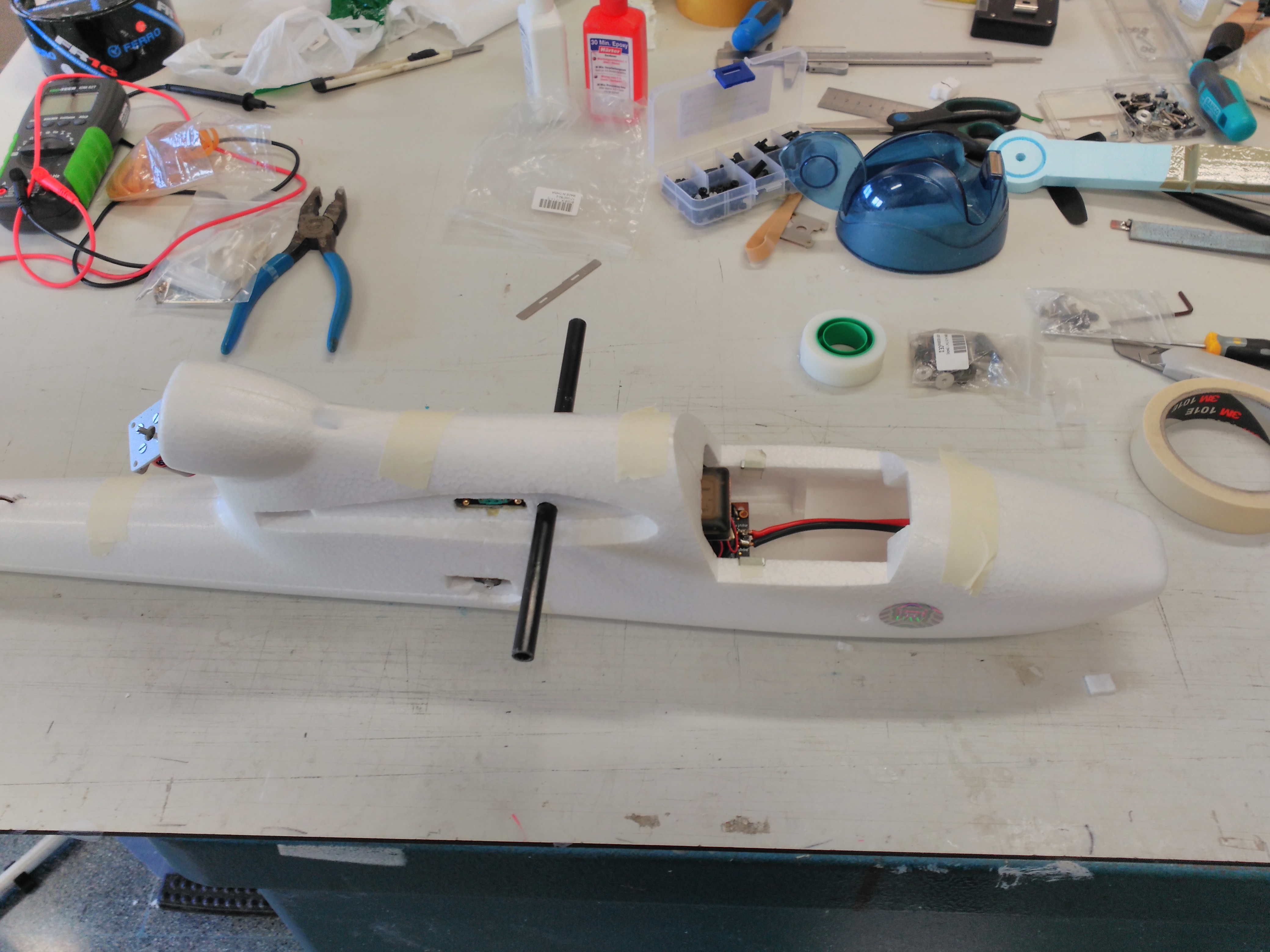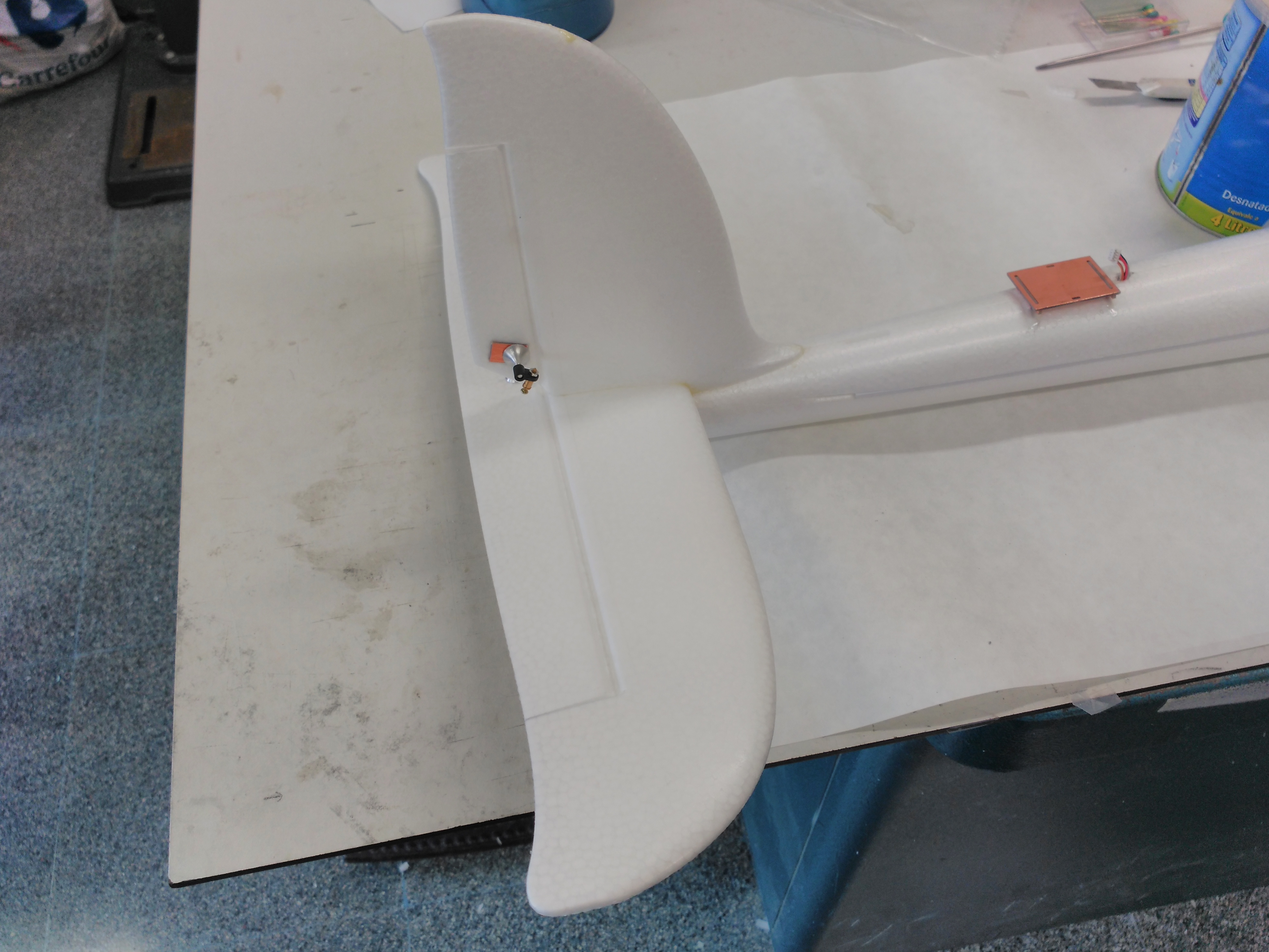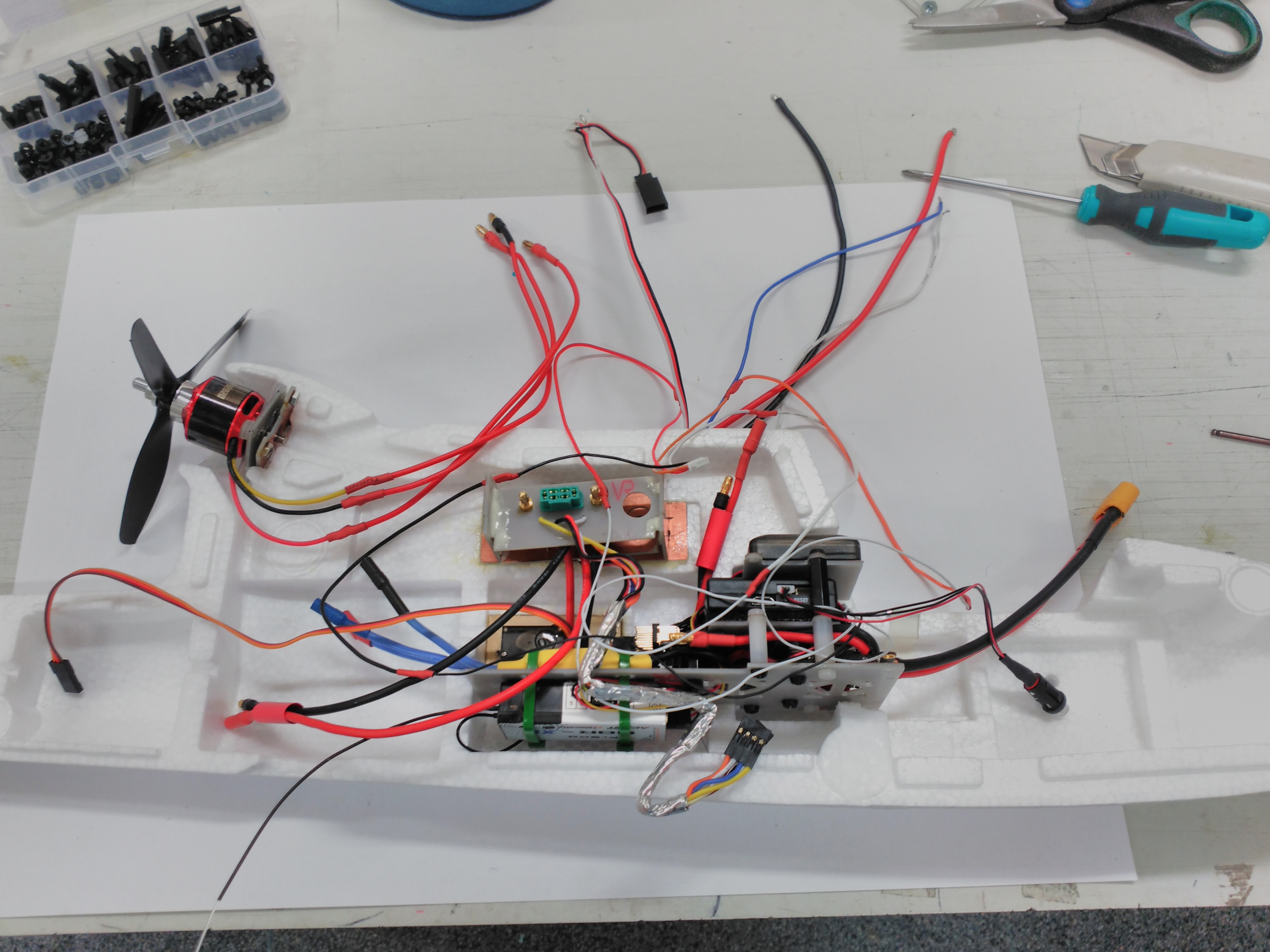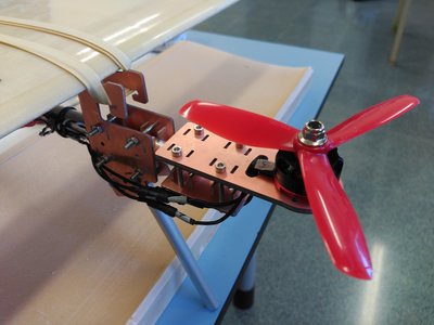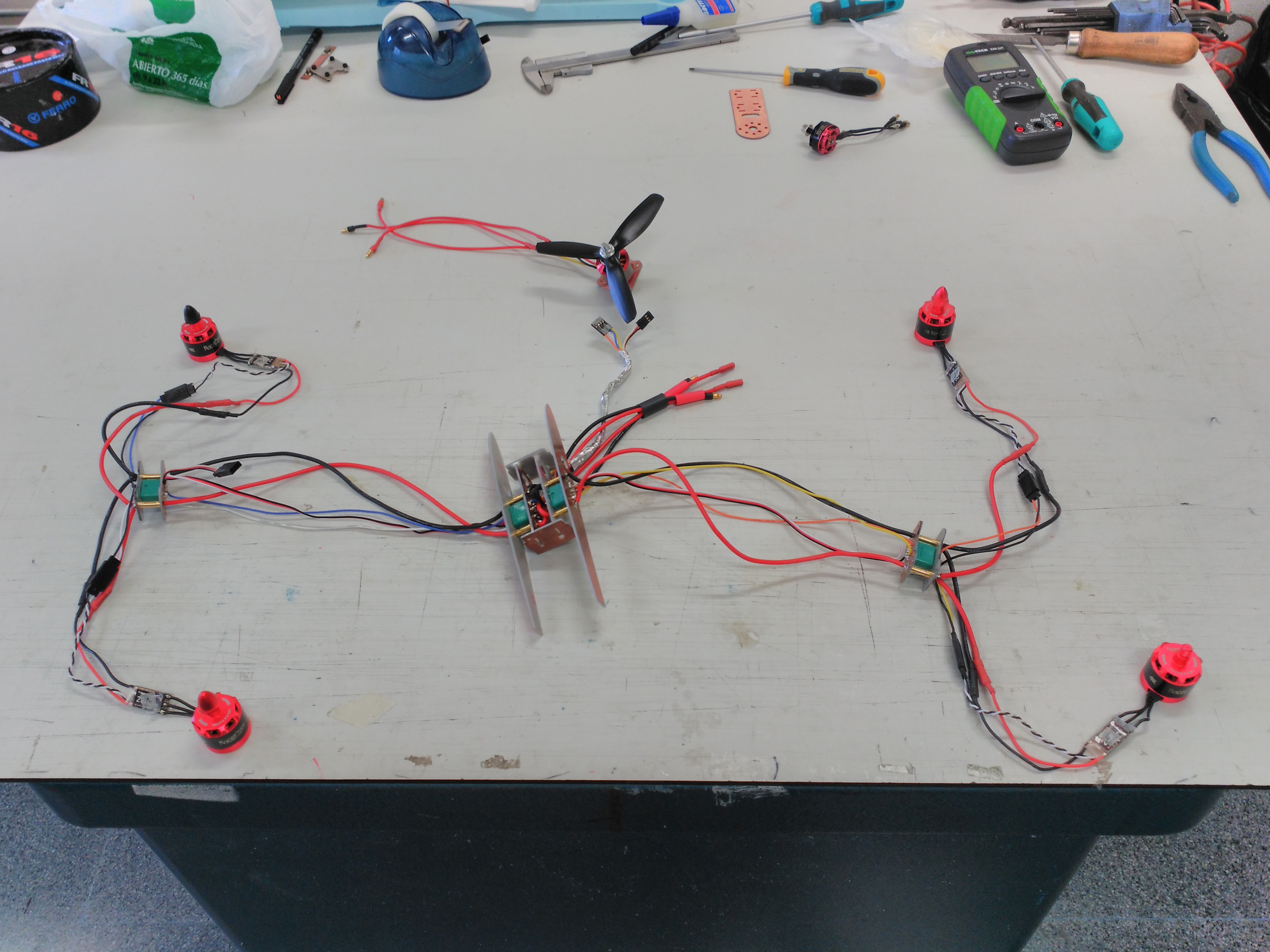 Bueno pues con todo esto y después de hacer una pesada de los componentes (peso final estimado 1700 g) y unas pruebas rápidas en el banco para saber los empujes de motores (unos 800 g 25 A para avión y 700 g 10 A los del multicóptero) nos ponemos manos a la obra con la duda si este pequeñín será capaz de ser un quadplane operativo.