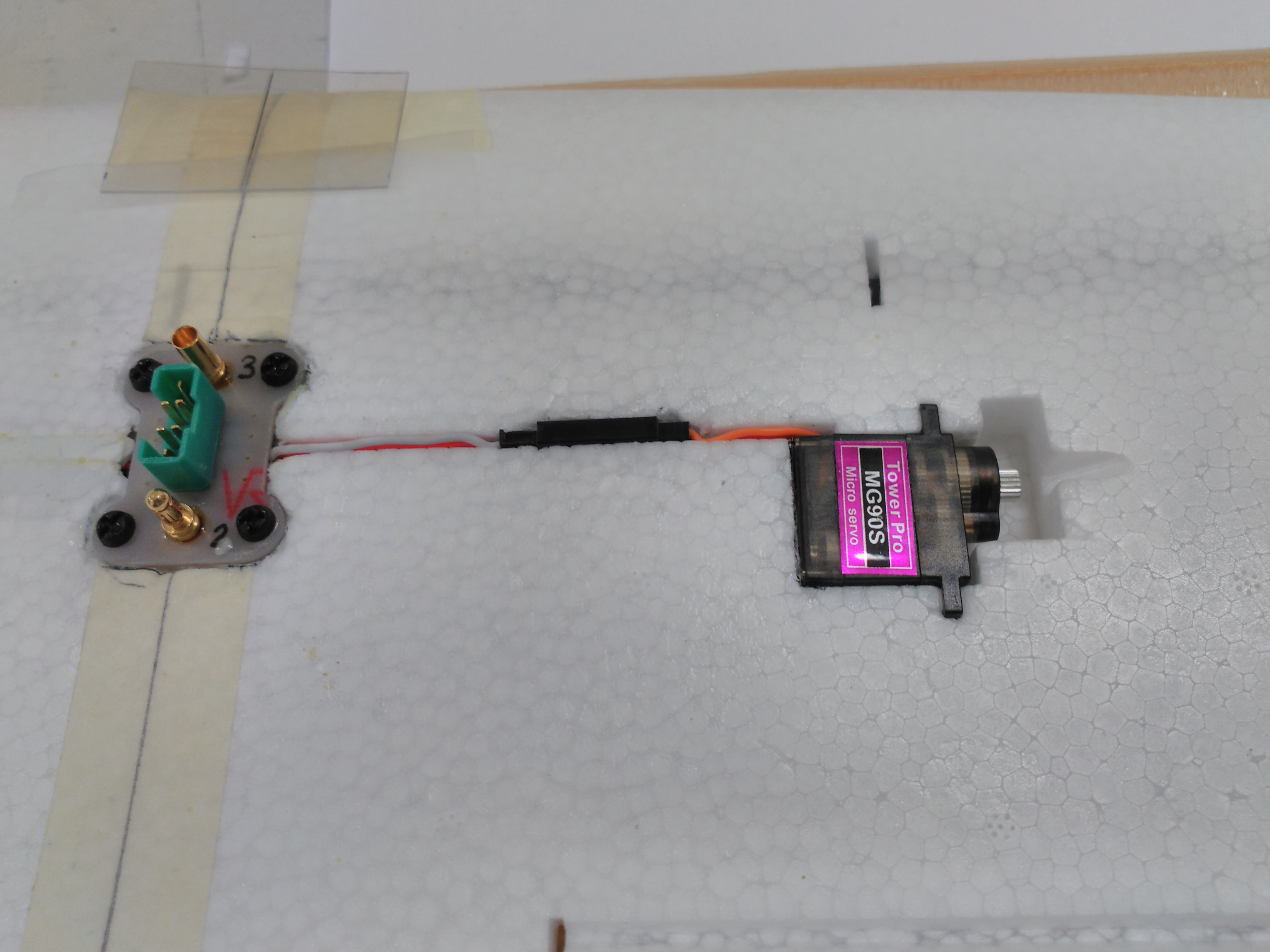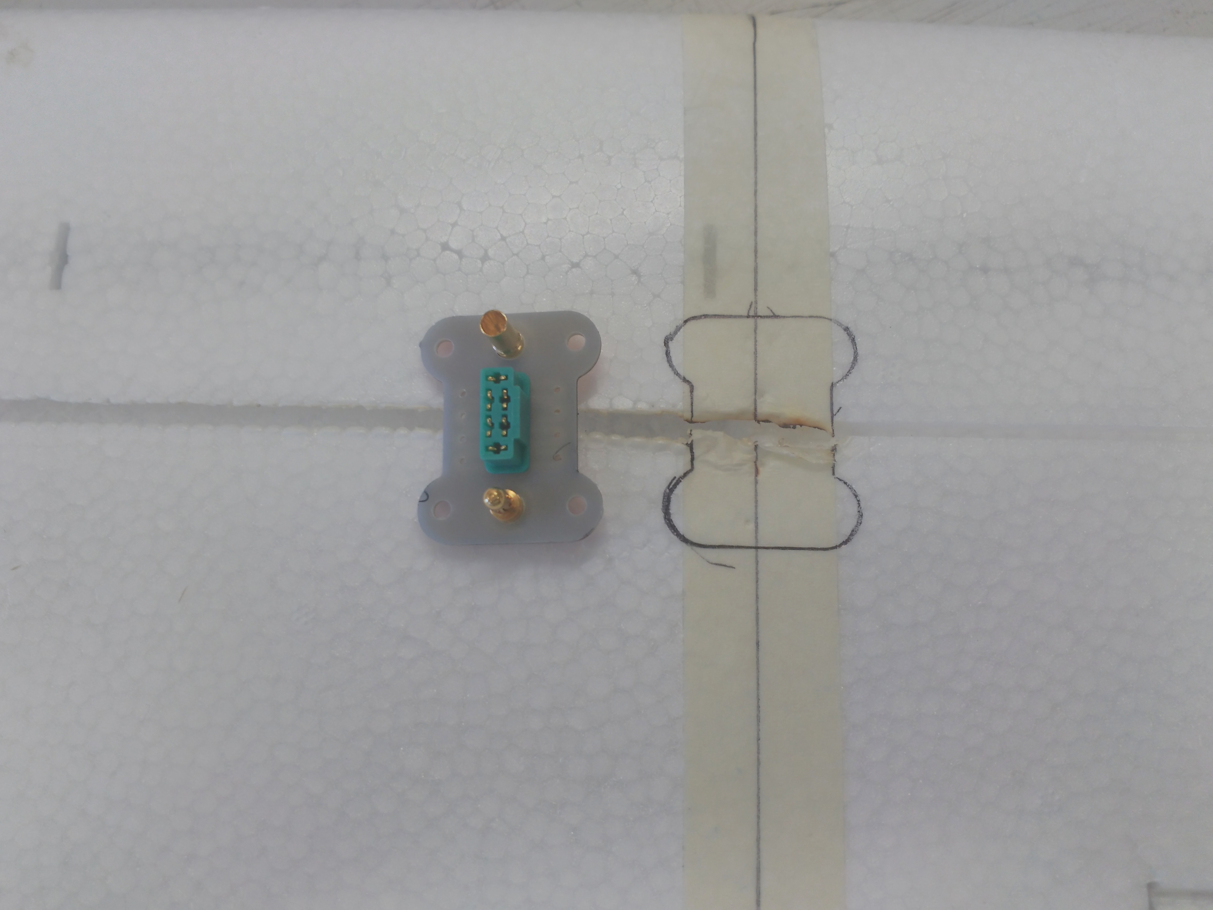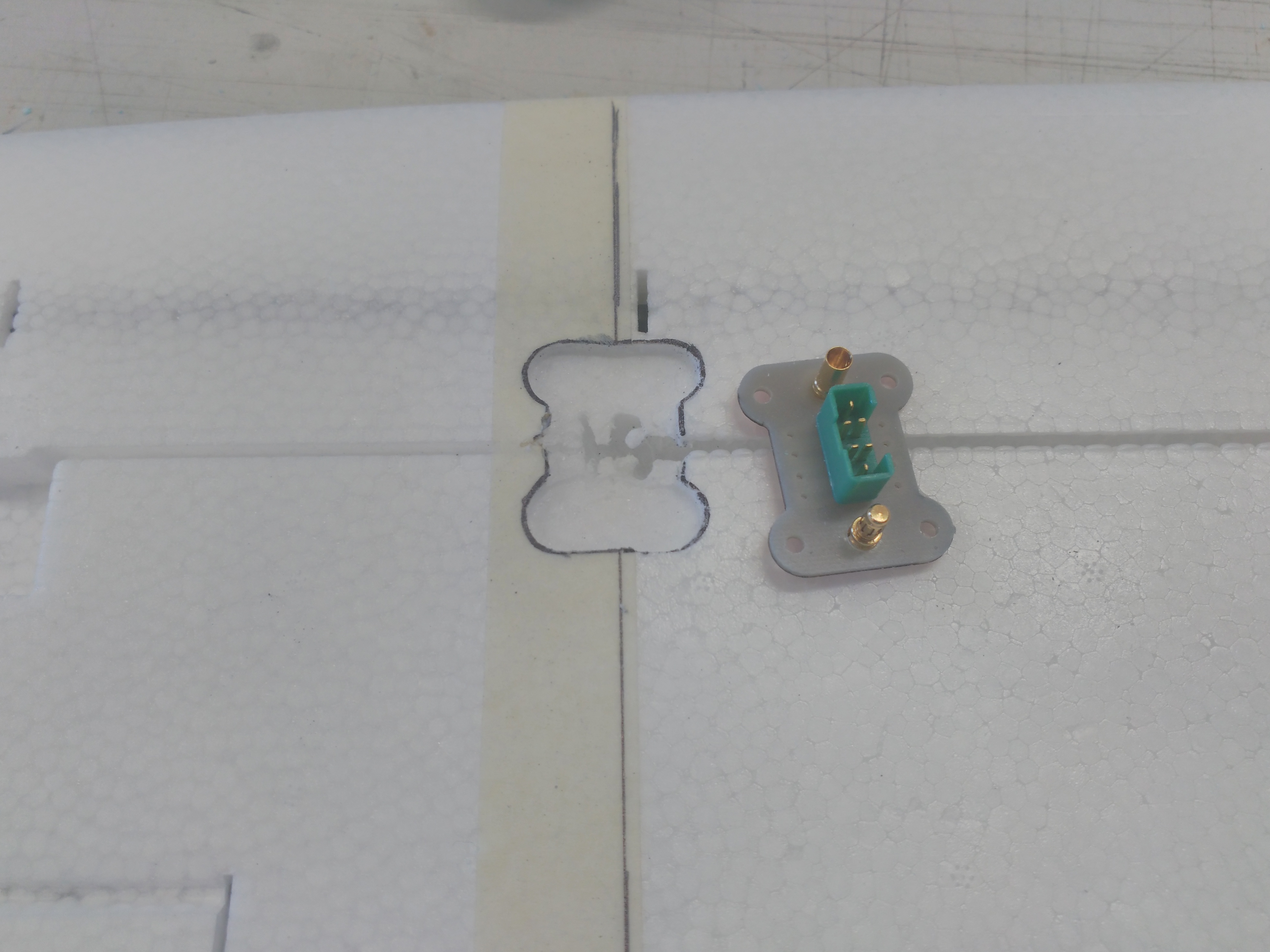 Para conseguir esta premisa, hemos modificado la idea de un conector fruto de la experiencia adquirida en una previa plataforma operativa-funcional de ala-multicóptero que hemos realizado para acometer este proyecto con ciertas expectativas de éxito. Con este conector conseguimos hacer la conexión rápidamente de la alimentación de los dos variadores, de las señales de control de los mismos y del servo de alerón del ala.