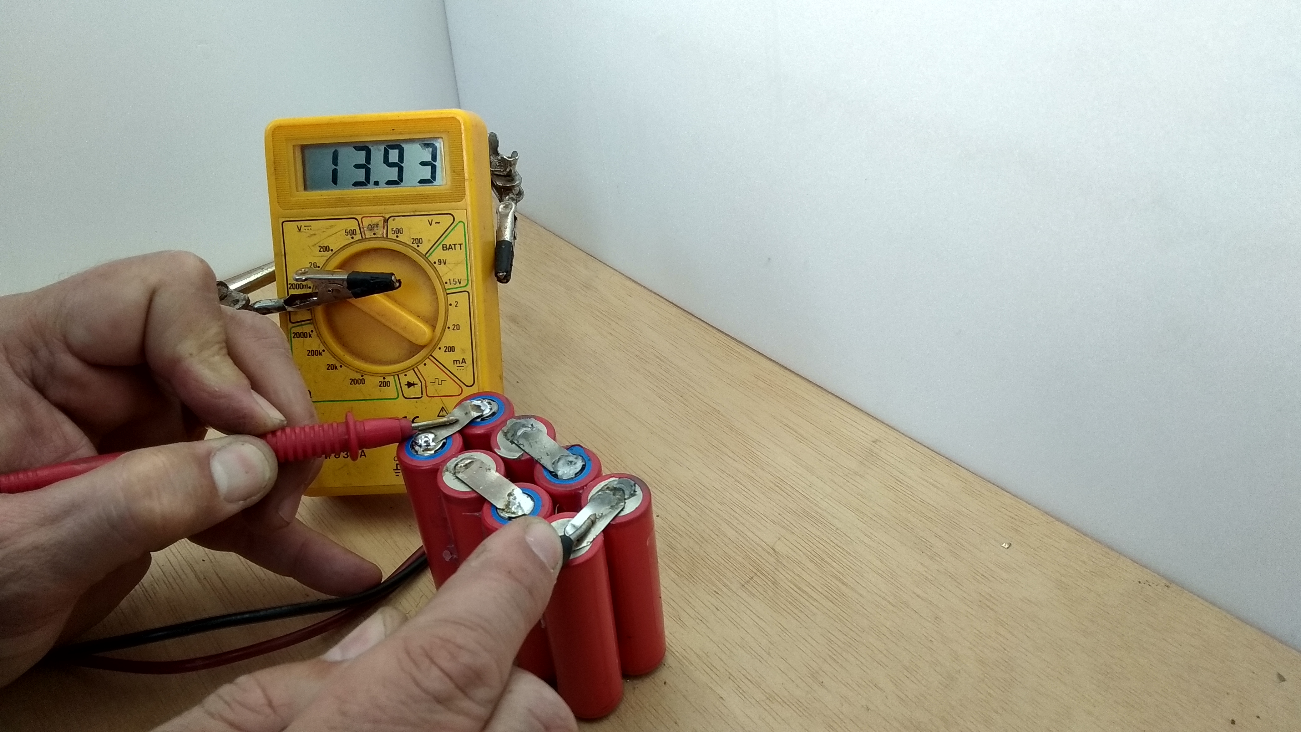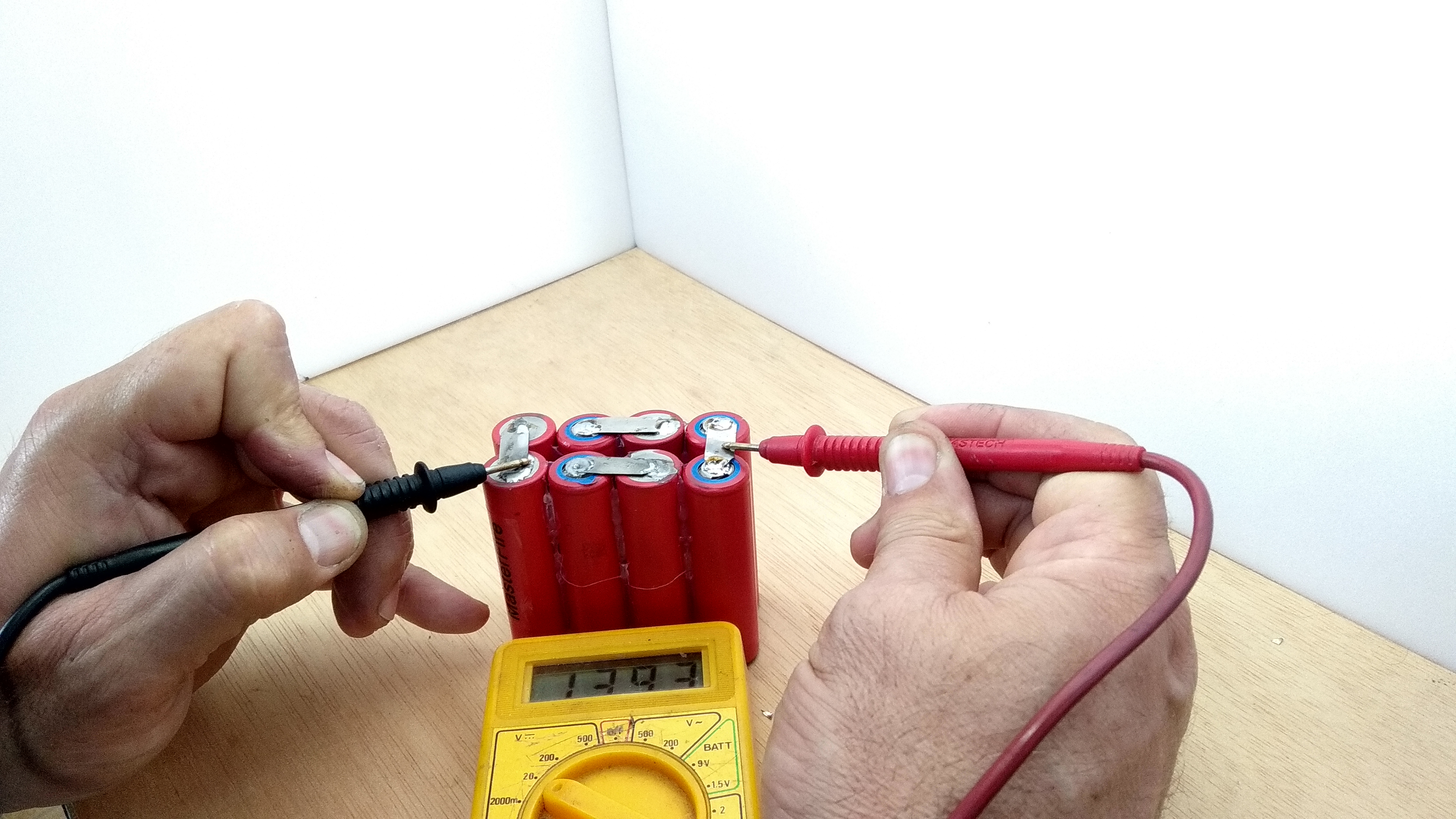 Si medimos con un tester el positivo y el negativo que nos han quedado libres podremos apreciar que, de baterías de 3.7v y 3500mAh hemos conseguido sumar los voltajes y llegamos a 14v manteniendo los 3500mAh