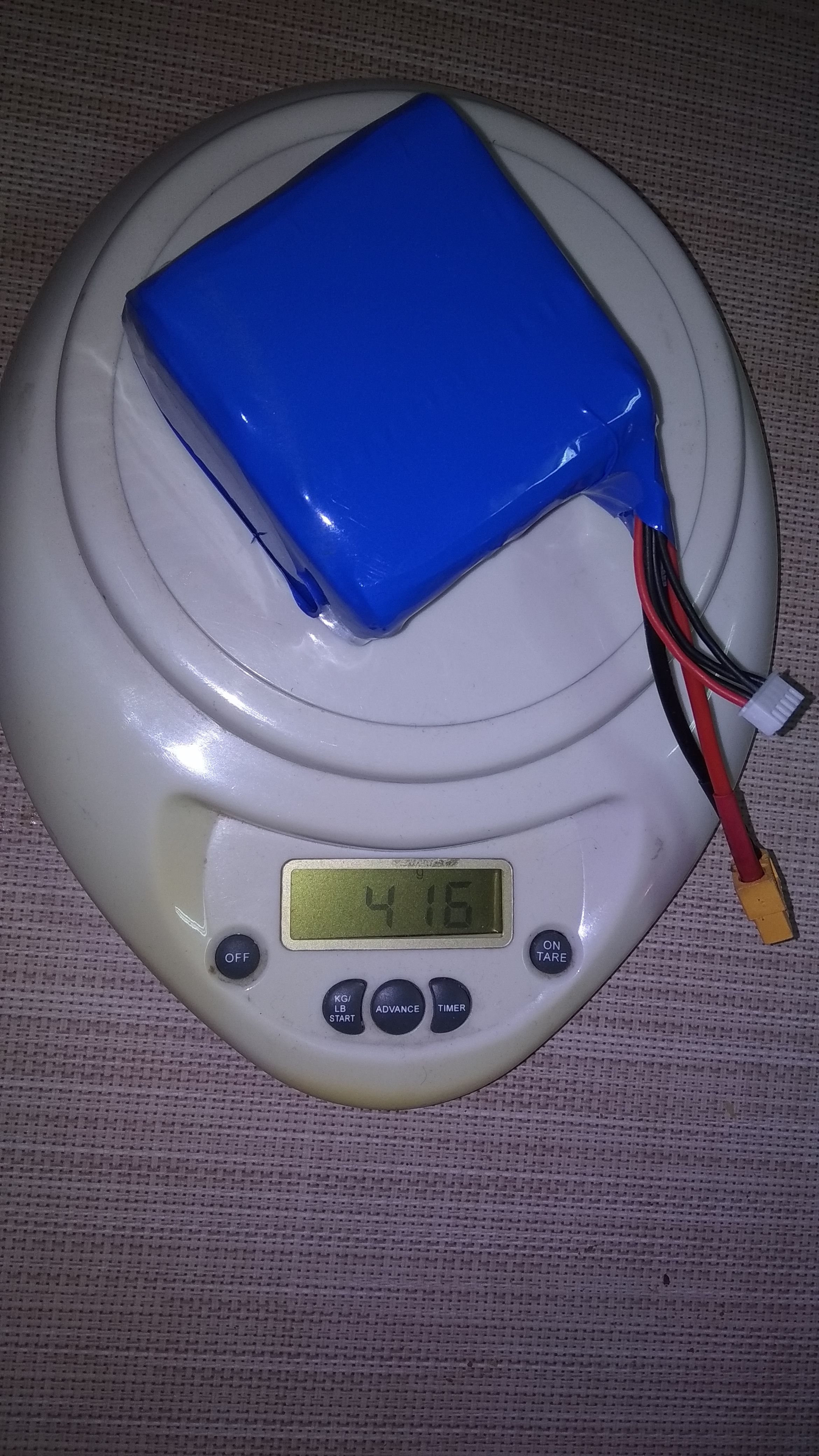 Bateria a 4s 2p: Tendra un voltaje de 14,8v, una capacidad de 7000mAh, una capacidad de descarga continua de 20A y un peso de solo 416g (59,43g por Amperio a 4s)