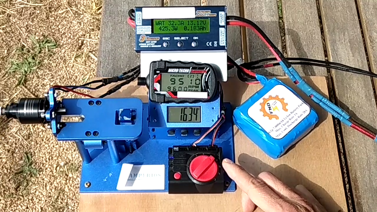 También hemos aprovechado que nos juntáramos para realizar los test y he llevado una batería que vengo usando hace ya casi 2 años que es de 3s3p es decir 11,1v y 10500mAh , donde la descarga continua permitida es de 30A y Picos de 40A aunque este motor a 3s no consume más de 25A. Pero en el vídeo que subirá raul se puede apreciar como mantiene el consumo constante sin problema y que a pesar de que ya tiene bastantes usos las celdas siguen estando parejas y en buen estado.