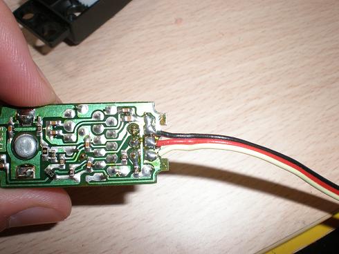 Estoy intentando invertir un servo. Tiene unos años y no es de una marca conocida (C&F). Comparándolo con el típico HXT900, que al ser transparente no hace falta abrirlo, en él se ve que van unos cables del potenciómetro al motor como muy bien indicais que hay que invertir, pero en este servo, las patas del poteciómetro van soldadas al circuito, y no sé si tengo que hacer la conexión cortando y soldando en la misma placa del cirtuito, o si lo que habría que hacer es cortar y soldar en las patas del potenciómetro que son bastante largas. Dejo unas fotos para que se vea mejor.