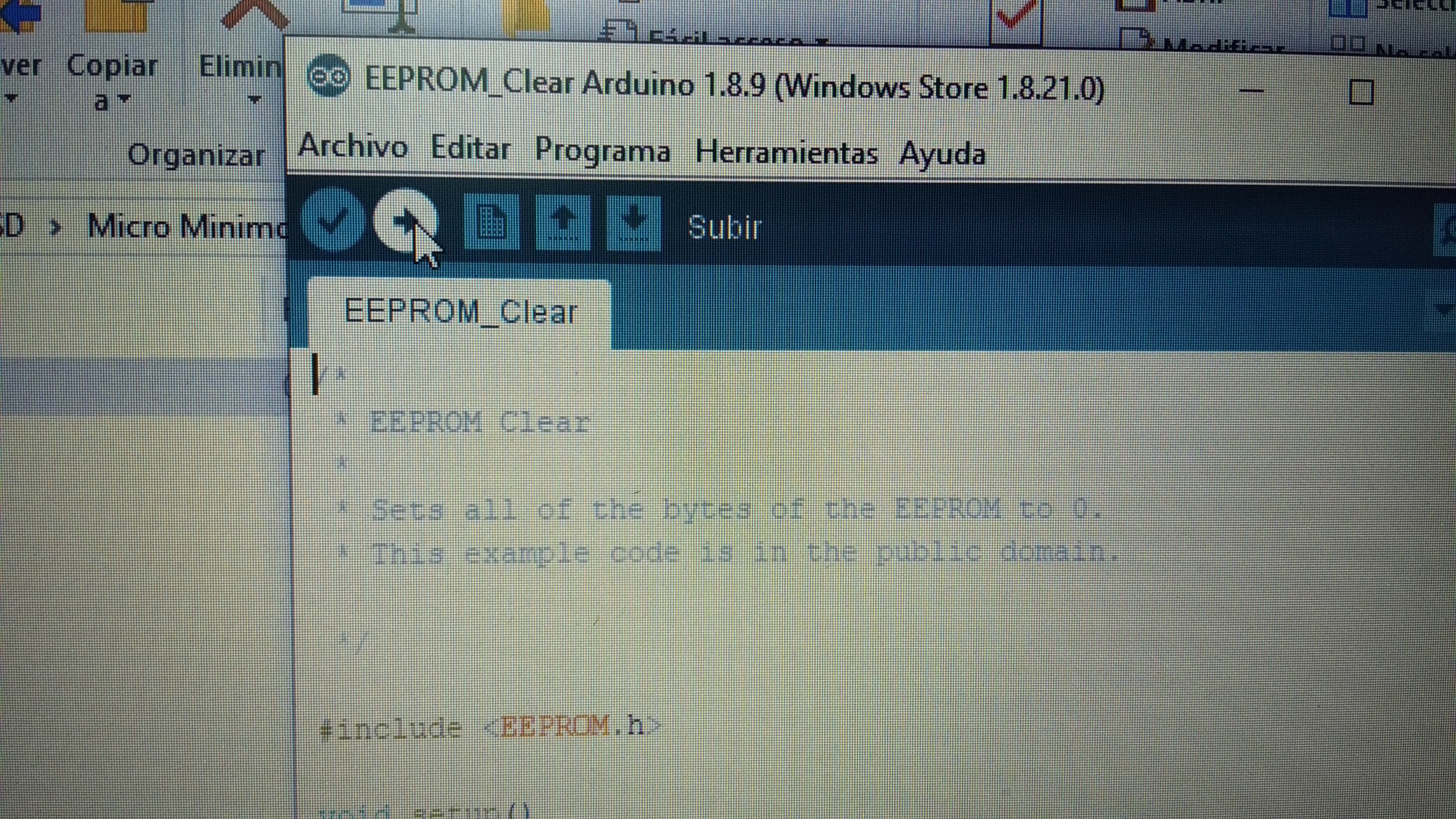 Luego una vez realizadas las descargas y descomprimidas las carpetas en un directorio que nos resulte facil de acceder, y ademas tener listas las conexiones entre el programador usb y el micrmoniosd, sin enchufar el usb al pc, procederemos a abrir el archivo eprom_clear.ino