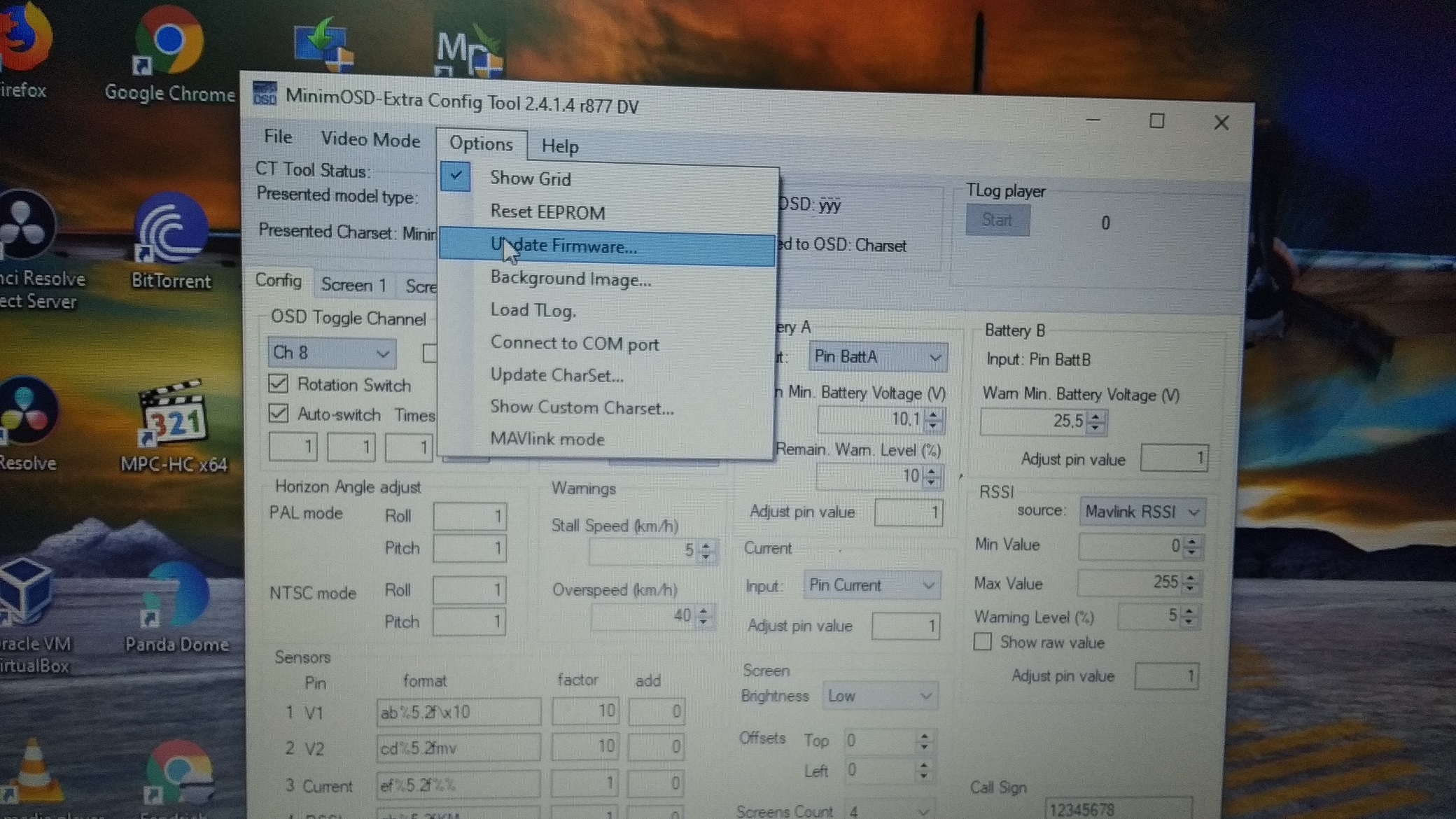 Luego vamos a Options y seleccionamos Update Fiirmware