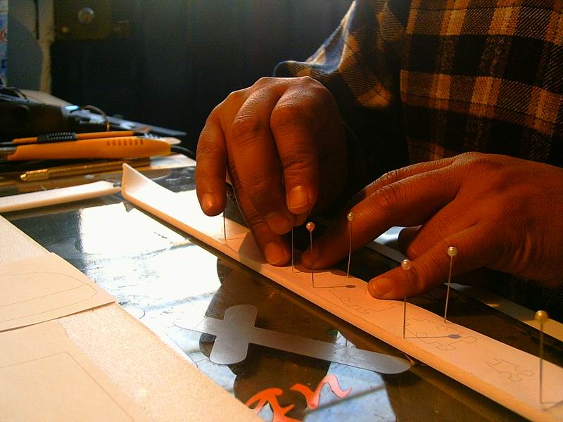 para pasar los planos al depron, yo recorto el perfil de la pieza, la pego al depron con cinta de pintor por los lados, y lo corto con un cutter. Asi sale bastante bien, pero seguramente habra sistemas mejores jejeje.