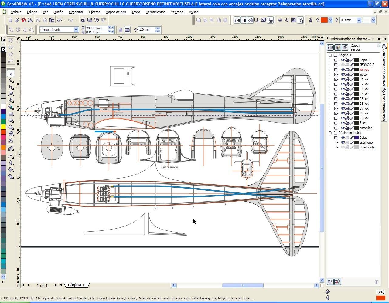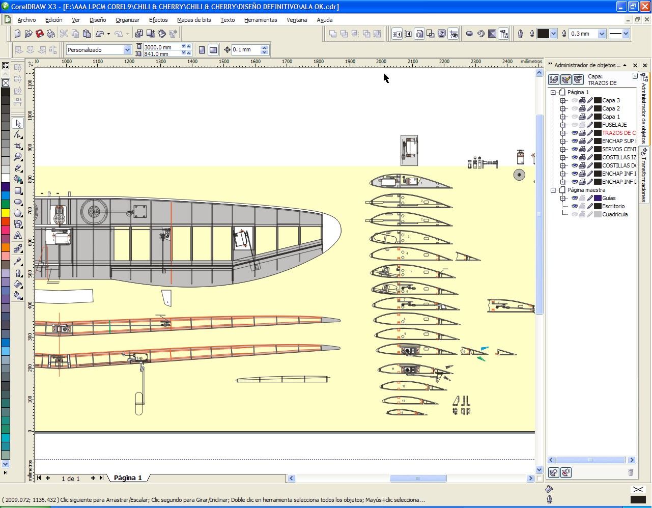 Para que te hagas una idea de lo que se puede hacer con paciencia y el Corel, tanto en planos como en dibujo digamos artístico, te pongo unas capturas de las pantallas del programa, las tres primeras son las alas, fuselaje y un detalle de una cuaderna del H3 Altaír. A la derecha de las pantallas puedes ver la persiana de capas que permite ver o esconder cada capa por separado.