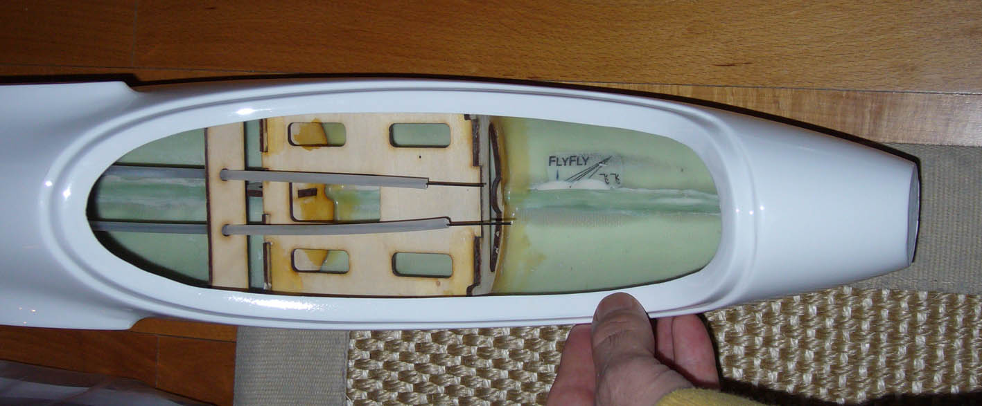 El fuselaje tiene una gran tamaño, o por lo menos me lo parece, ya que no estoy acostumbrado a veleros tan grandes. Lo que es cierto, es que la calidad del fuselaje es excelente, construido en fibra de vidrio, y recubiero por una capa de gel coat con terminación blanca. Las uniones de las dos partes laterales del fuselaje están perfectamente tapadas, y desde fuera no se aprecian en absoluto. Tan sólo por dentro. Tiene instalada de fábrica un sistema de doble varillaje por cables flexibles en sus fundas para el control de la dirección (un tipo pull-pull). En la parte delante, hay una bancada para colocar el servo de la dirección. Toda la longuitud del fuselaje está reforzado con cuadernas de contrachapa, a unos 20cm cada una. El servo de profundidad se coloca en un hueco que tiene el estabilizador vertical, de forma que tendremos una conexión teóricamente sin holguras, al ser directa. El morro ya viene cortado y con una bancada de contrachapado para la instalación del motor. La versión Glider no trae el morro cortado, sólo la versión Electro.