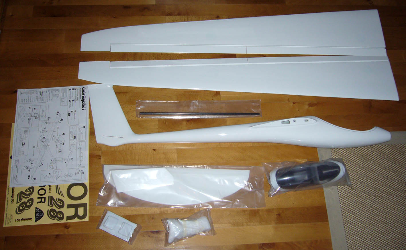 El contenido de la caja donde se pueden ver todos los elementos: cuerpo, alas, estabilizador horizontal, carlinga, barra de carbono, y bolsa de plástico con "cosillas varias"