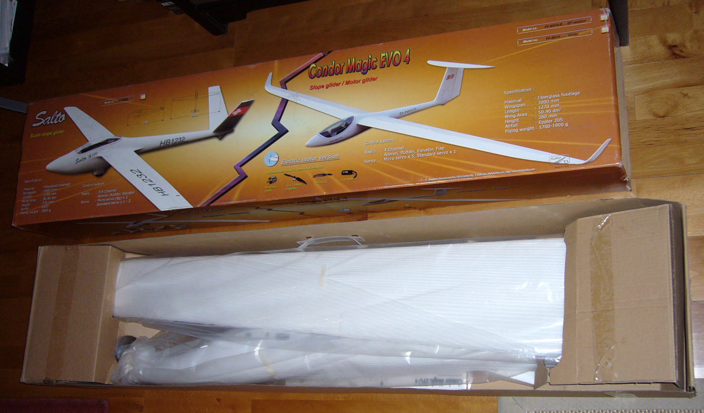 Una cosa importante, y para intentar aclarar la confusión que veo que existe en la red sobre este modelo: antiguamente el Condor Magic era fabricado por una marca italiana llamada Scorpio, y su envergadura era de 2.9 metros. Scorpio dejó de fabricarlo, o la propia marca cerró, y ahora la marca FlyFly Hobby china lo fabrica en exclusiva para el distribuidor europeo HorizonHobby. A día de hoy, la nueva versión del Condor tiene 3 metros y le han incluido flaps. Q yo sepa, la historia es más o menos tal y como la he explicado.