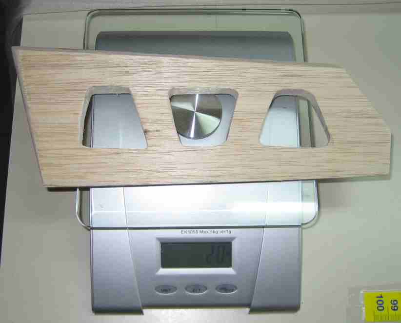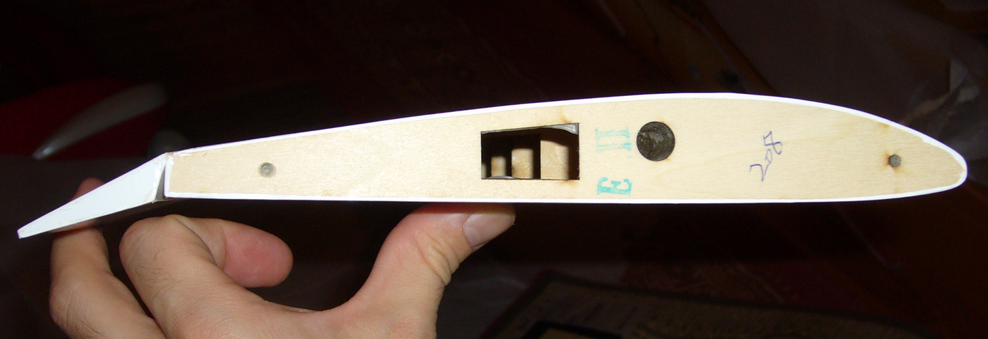 yo originalmente por no hacer una prueba de montaje con el equipamiento que habia elegido me encontre que con el modelo practicamente acabado no podia conseguir el centro de gravedad sin añadir lastre en el morro, asi que decidi remediarlo, y eso me llevo a trasladar el servo del timon de la cola al morro, tambien aligere el timon y el estabilizador horizontal y los volvi a recubrir, resultado aprox 150g menos de peso.
