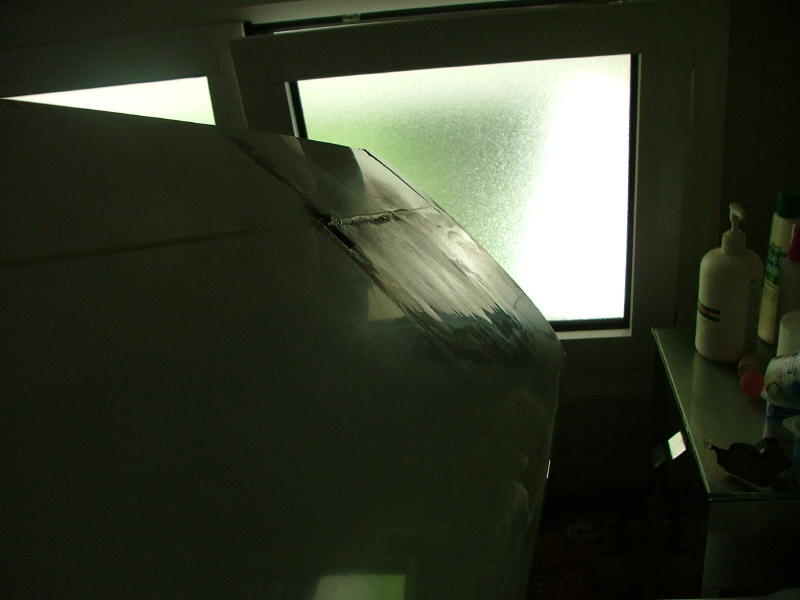 Como previamente habias puesto el precinto por la parte del extrados, la superficie te quedará acabada en el borde de la rotura y de la parte del borde de ataque te tocará lijar un poco con un taquito de lija, y por debajo al tener menos forma el ala será mas sencillo de lijar.