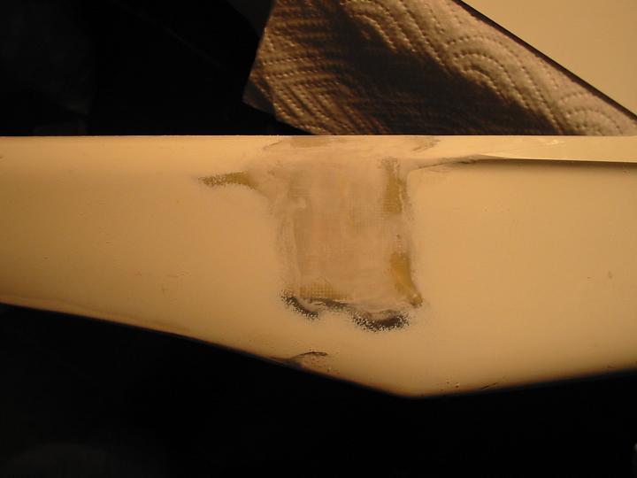 Y con esta pasta rellenas el agujero, haz que el ala descanse de tal forma que el epoxi ni se te valla para adentro del ala, ni se te caiga fuera, es decir , levantala un poco de l borde de fuga.