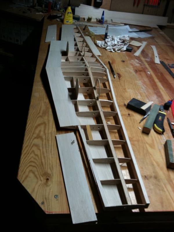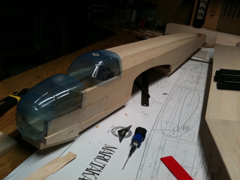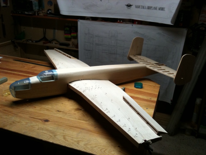 Pero esto que es ?.... Eres una maquina de construir, ¡ que velocidad !, es increible, un par de tardes revisando el plano viendo posibles soluciones y hala, ya está hecho el fuselaje, las alas, enchapado..... Que, ya estará haciendo el rodaje ¿ no ?