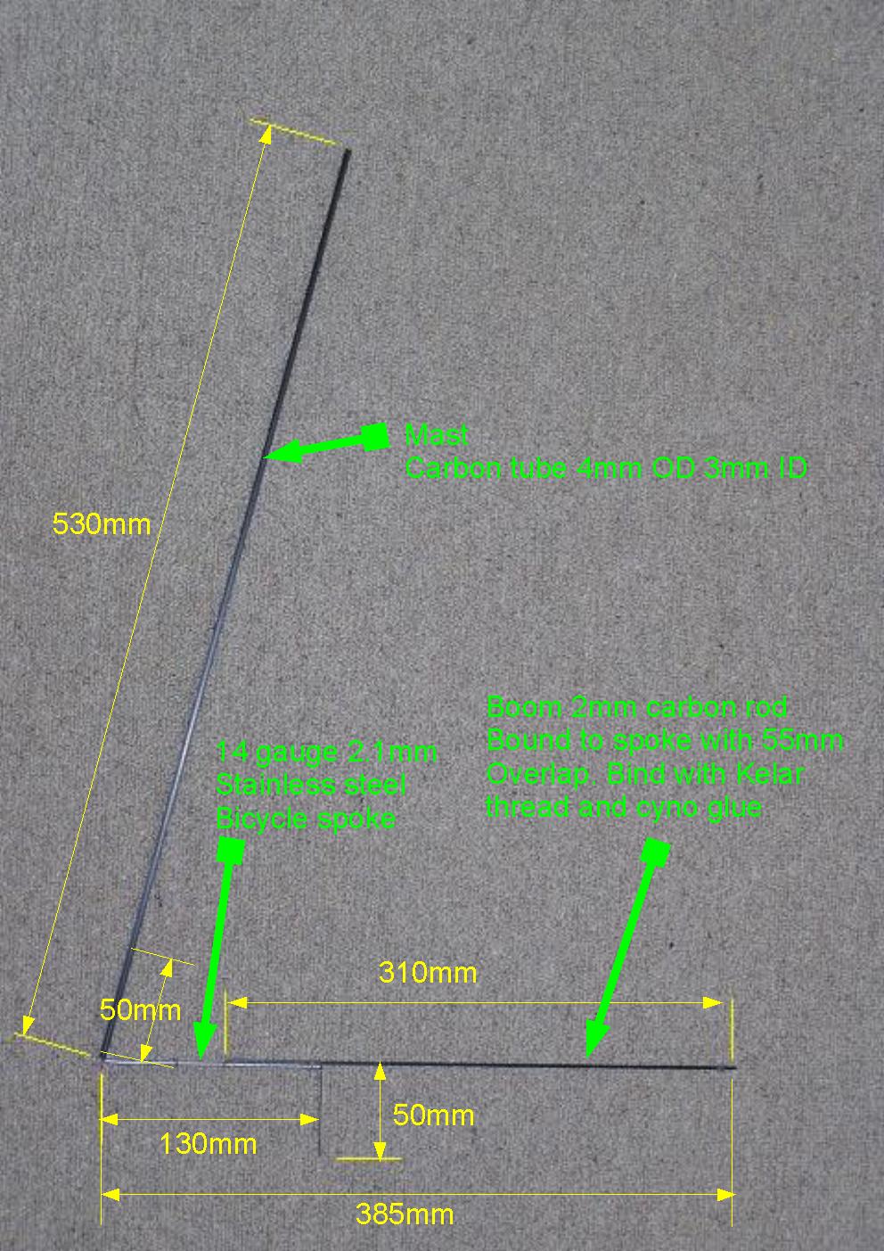 el aparejo esta hecho con tubo de carbono de 3 o 4mm para el mastil y uno de 2mm para la botabara. las dos piezas van unidos con varilla de acero de 2mm (cuerda de piano) que se puede sustituir por radios de bicicleta que sera lo que yo usare.