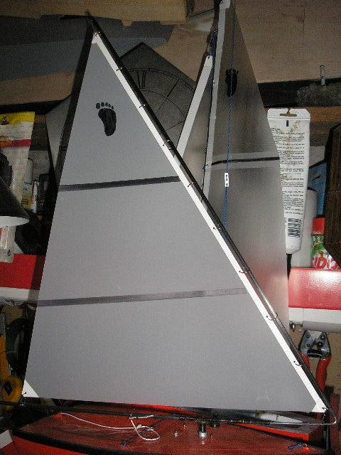 os pongo aqui varios ficheros, el zip es una plantilla para hacer una vela en 4 trozos (con este sistema la vela coge bolsa). y varios ficheros del aparejo , y unas fotos de la vela que he terminado hoy , el mastil va enfundado en la vela con lo que nos ahorramos cuerdecitas ojales. para reforzar los picos que reciben las fuerzas los he reforzado con cinta americana, los paños los he pegado con cinta de dos caras.