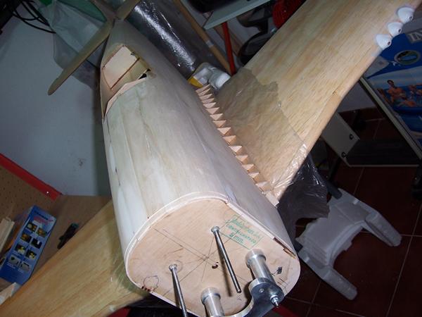 Bueno, otro empujón mas, he terminado los karmans como se ven en las fotos, a base de una estructura hecha con triangulos de contrachapado de 3 mm lijados dandoles la forma y recubriendolos de listones de balsa, con un poco de pasta`pluma, Por fin he recubierto el fuse con fibra, laminándolo y un pase de lija para dejarlo listo para la imprimación. Pero antres de eso tenía que terminar el tema de la cabina, la idea de Victor no me convencia mucho, así que lo he modificado, a ver que tal me sale. Lucio que es un artista de los plásticos es el artifice de la estructura del marco de la cabina. Mañana lo recortaré en condiciones, lo terminaré y comenzaré a imprimar. eso mañana. Os pongo fotos del proceso. Se admiten comentarios criticas y sugerencias, así aprendemos todos. Saludos al foro.