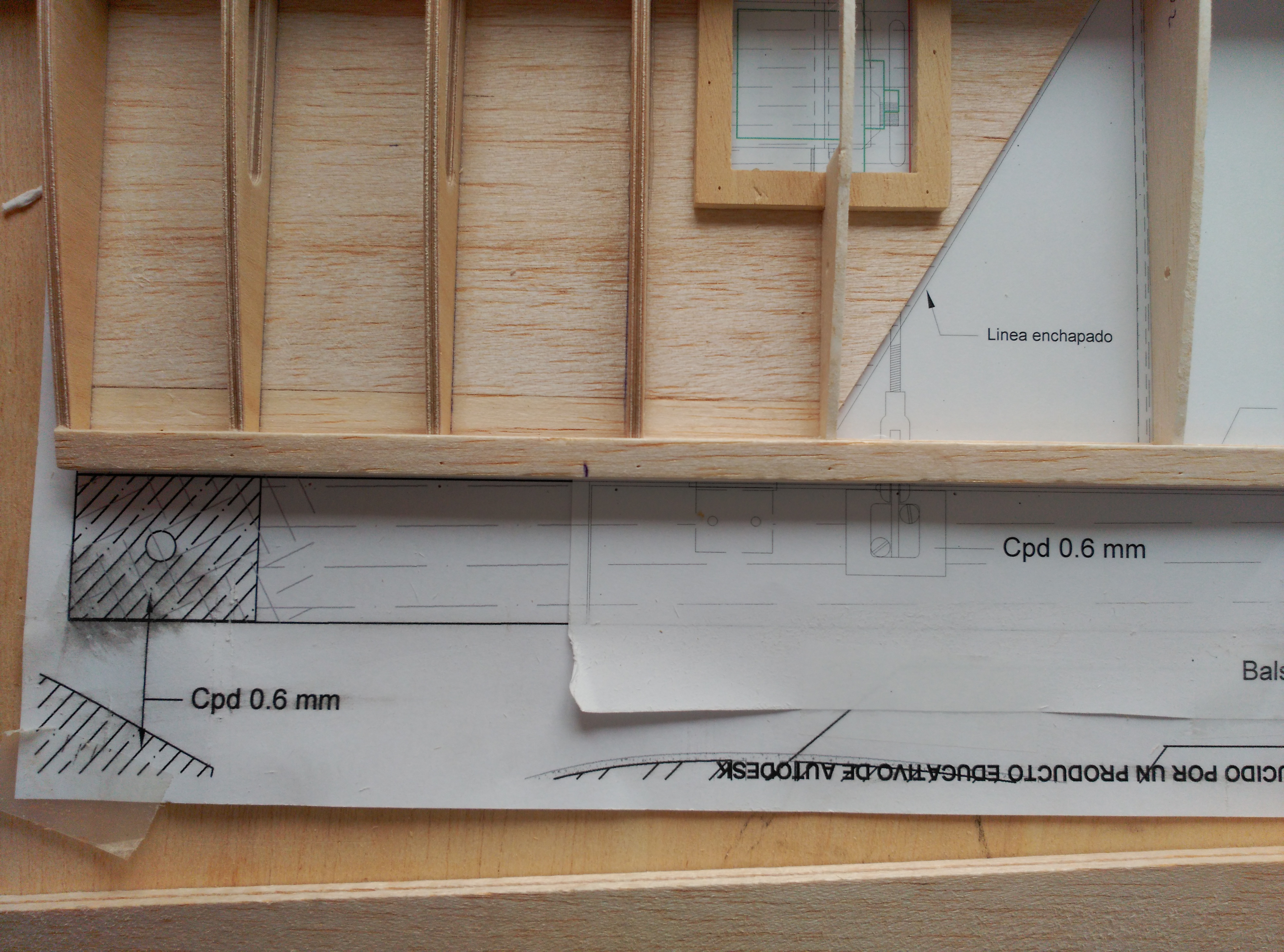 Para el pegado del refuerzo y costillas de contrachapado, nos ayudamos de una chapa de balsa de 2mm y un contrachapada de 3mm para dejar el espacio correspondiente para el refuerzo vertical y el diedro respectivamente.
