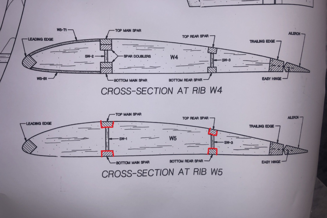 Te pongo lo que seria la Costilla entera, lo que se sale del trazo rojo, son el Larguero Borde de Ataque en Balsa a la Izquierda, y Larguero de Borde de Fuga tambien en Balsa a la Derecha, También los Largueros principales Centrales del Perfil en Pino, Observa que estos tienen un trazo mas oscuro.