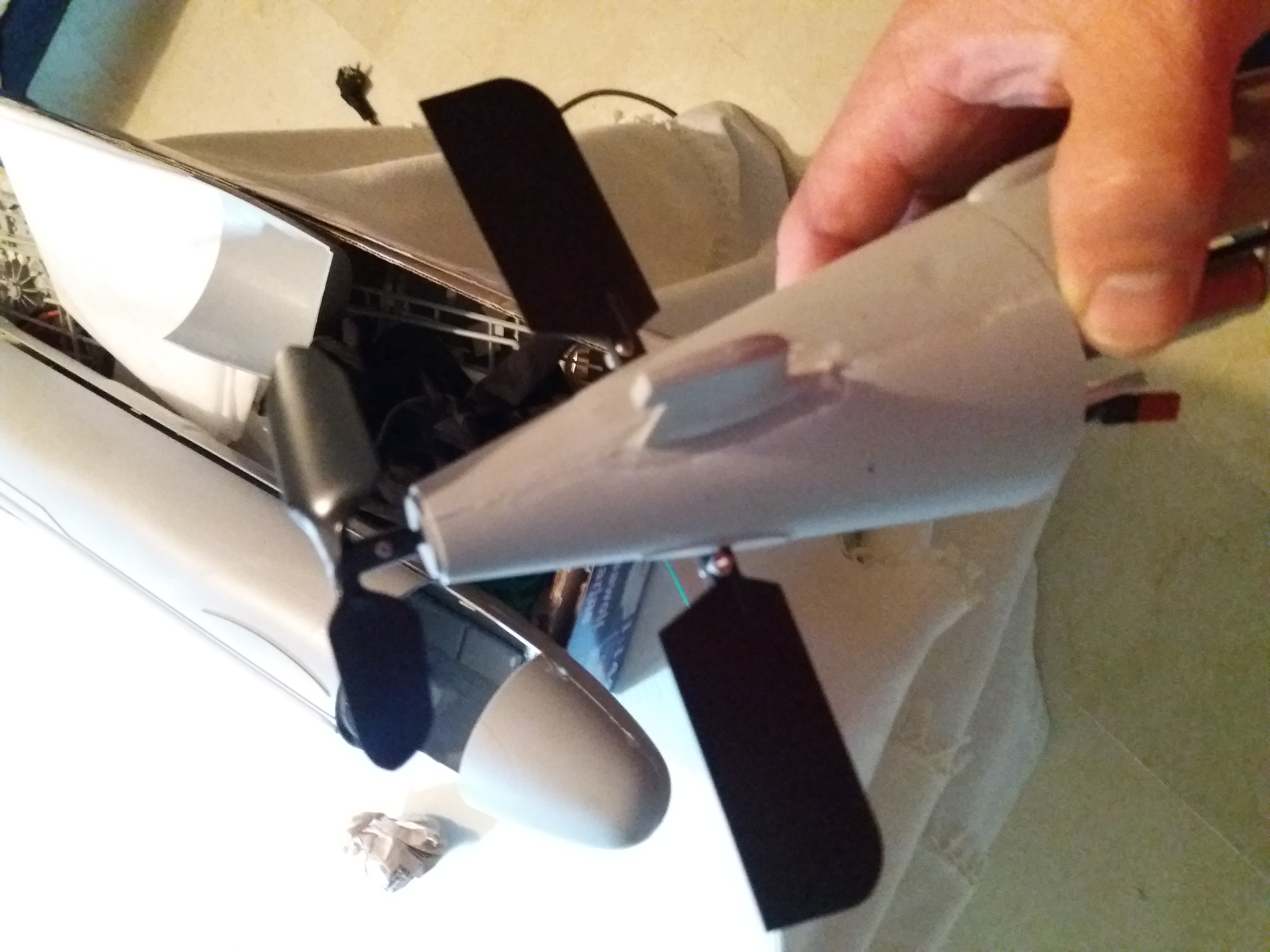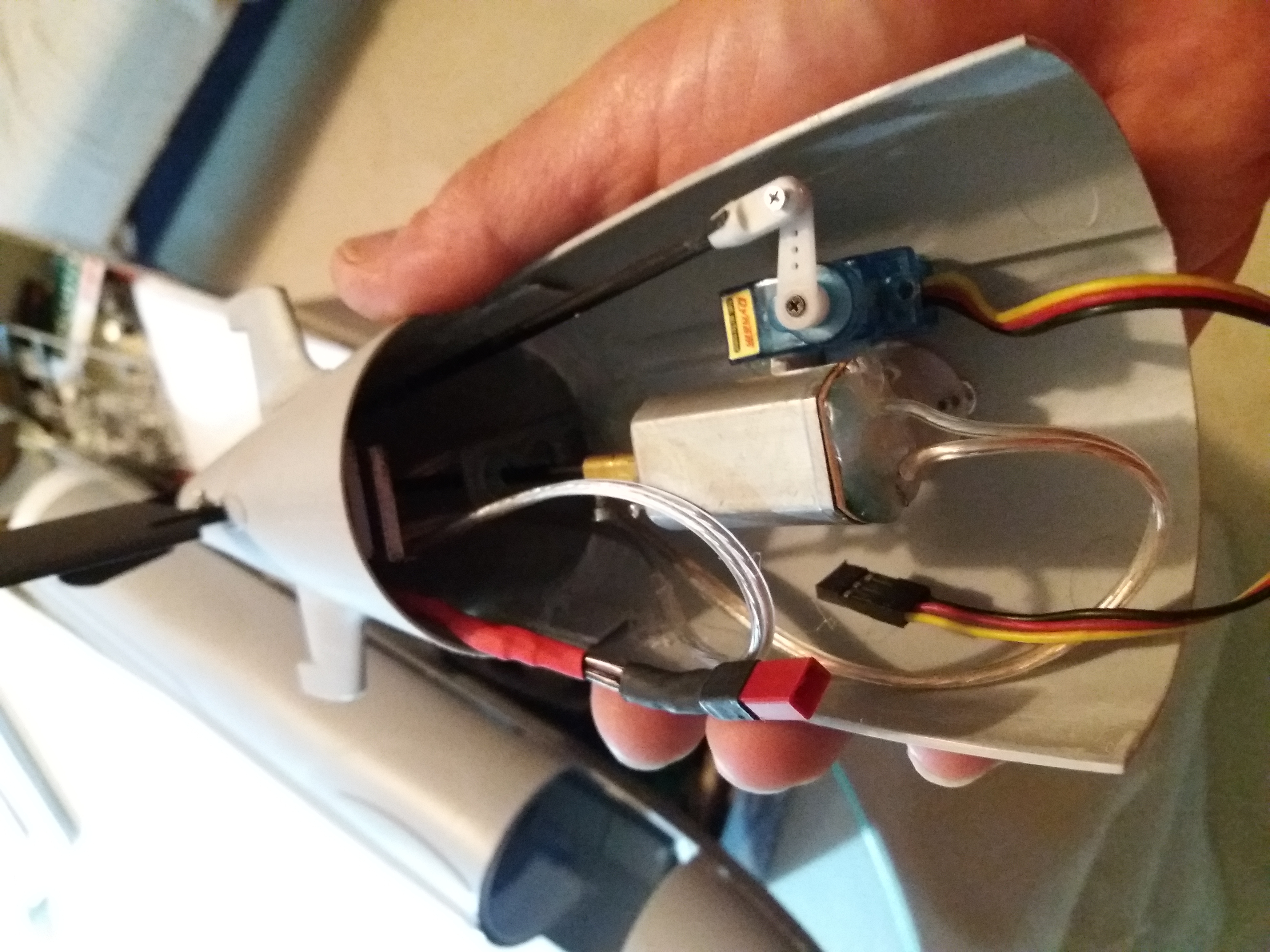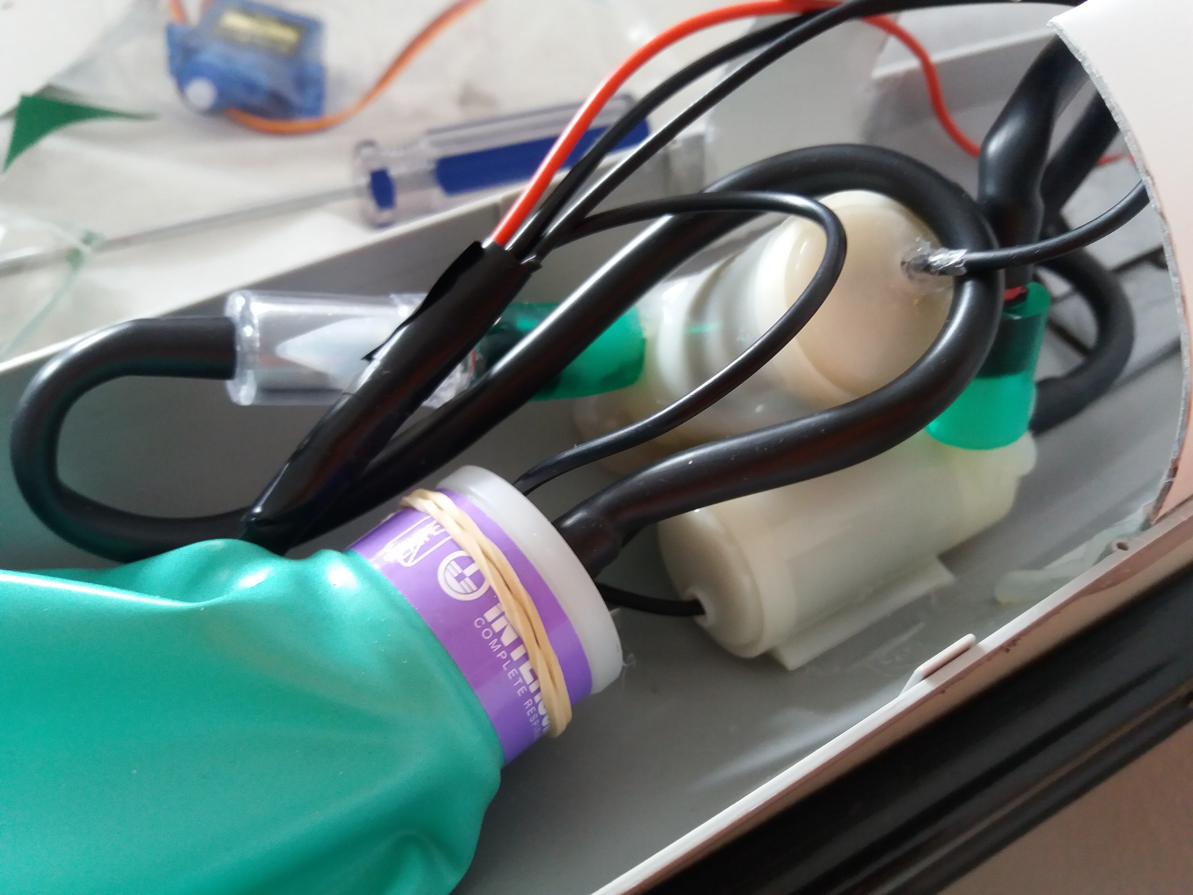 Resulta que hoy hago la prueba de la electrónica completa y al accionar las bombas resulta que, no sé porqué, se acoplan y se pone en funcionamiento el motor de la hélice y los servos se vuelven locos. Os pongo unas fotos de mi invento, todo muy artesano, jeje.