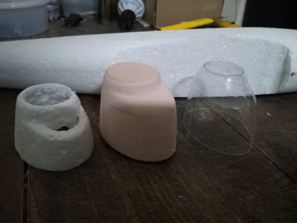 Ayer hice varias pruebas para el morro, pues Iniciado en su hilo lo hace replicando el original en escayola, pero acá es unmatrial dificl de conseguir. Así que probé varias opciones. De casualidad tenía un pedazo de poliestileno extruido, y es increible lo que aguanta de calor sin deformarse. Copié la forma del morro en un bloque conformado por varias piezas y lo usé para moldear una botella de refresco al calor de la hornilla...