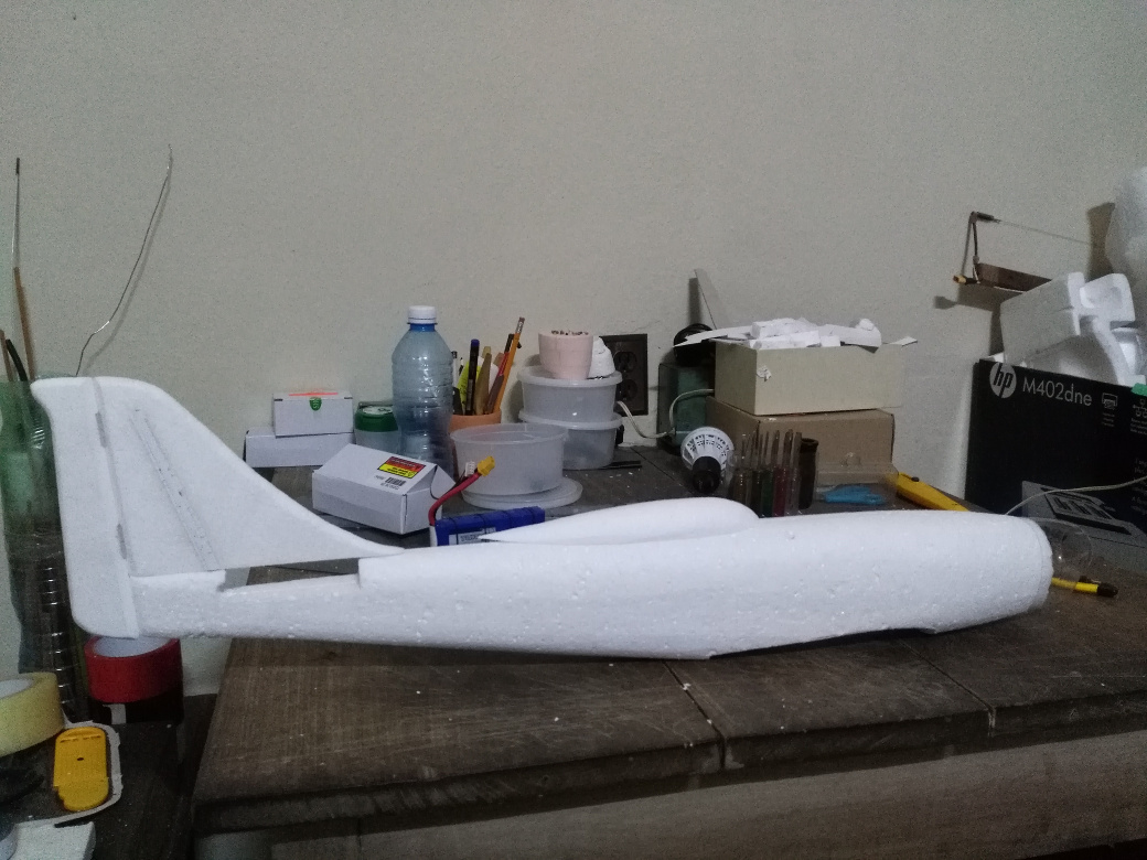 Yo continuaria por poner el motor,servos y bateria provisionalmente sujeto con cinta y ver como va quedando el C.G.
