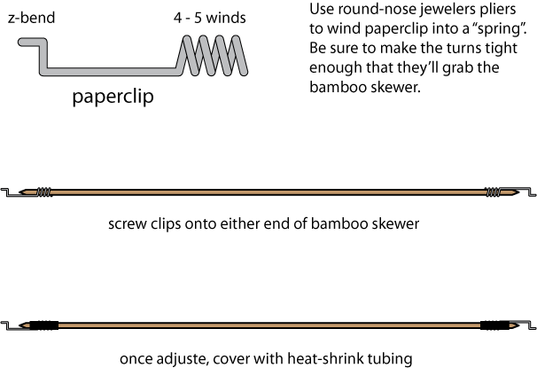 En la otra punta, una variante que encontré en un link, pero sustituyendo la varilla de bambú por las mias. (adjunto diagrama más abajo). Al final, despues de los ajustes, se termian con hilo y pegamento.