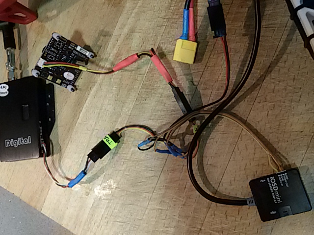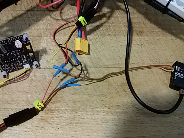Aquí te pongo fotos de las conexiones. Están como me indicaste y verificadas por el chico de la tienda, La imagen se transmite correctamente (pero sin OSD) y el led del iOSD parpadea en verde al conectarlo.