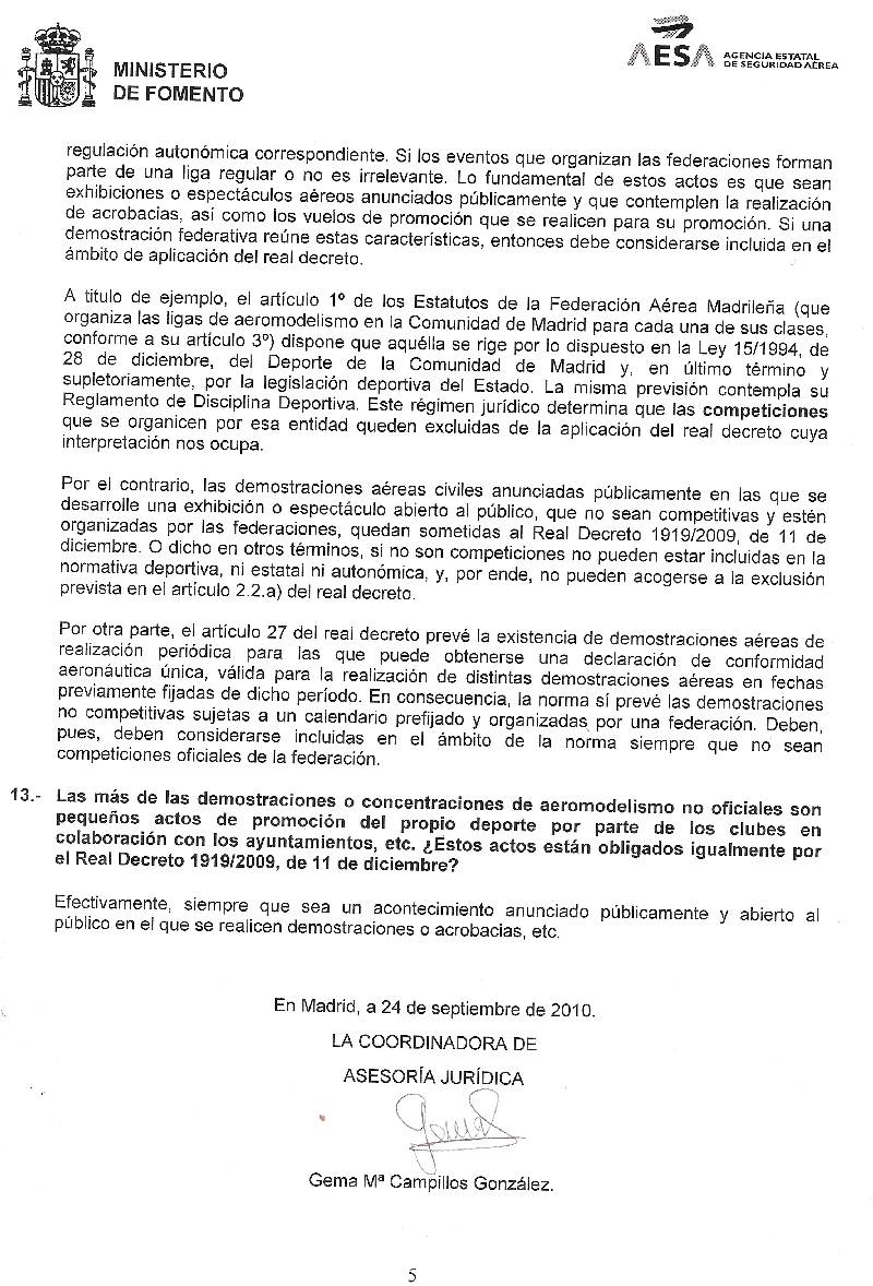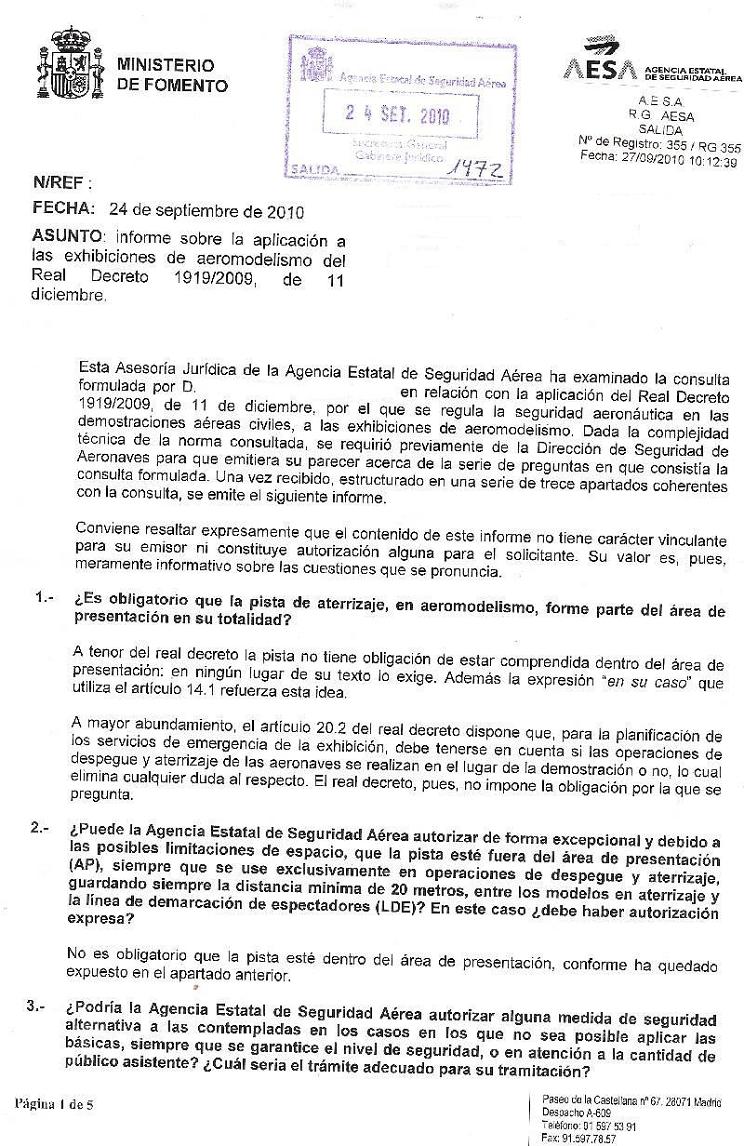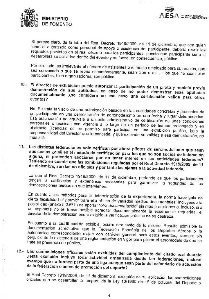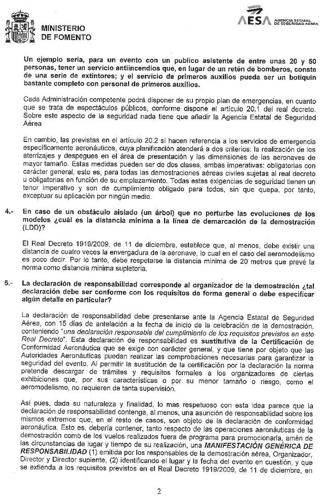 Sr. Perez, tiene usted todo el derecho del mundo a interpretar el documento de AESA como crea conveniente, tiene usted todo el derecho a actuar de la forma que mejor crea, ese documento es un conjunto de respuestas a ciertas preguntas relacionadas con la aplicacion del Real Decreto 1919/2009 y se ha preguntado a quien hemos creido conveniente, a quien se encarga de la seguridad aerea en este pais, a quien hay que informar de cualquier exhibicion de aeromodelismo con presencia de publico, a quien se encarga de aplicar el Real Decreto 1919/2009...pero como ya he dicho, usted es totalmente libre de no dar la mas minima validez a lo reflejado en ese documento, es cosa suya.