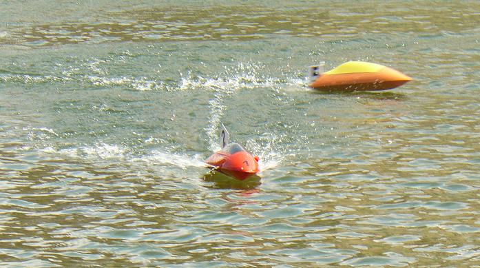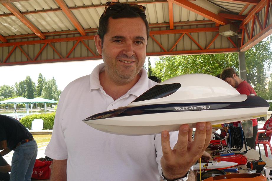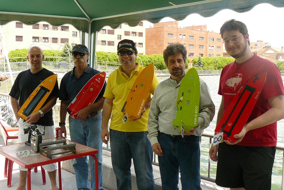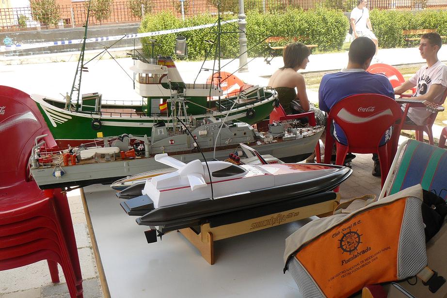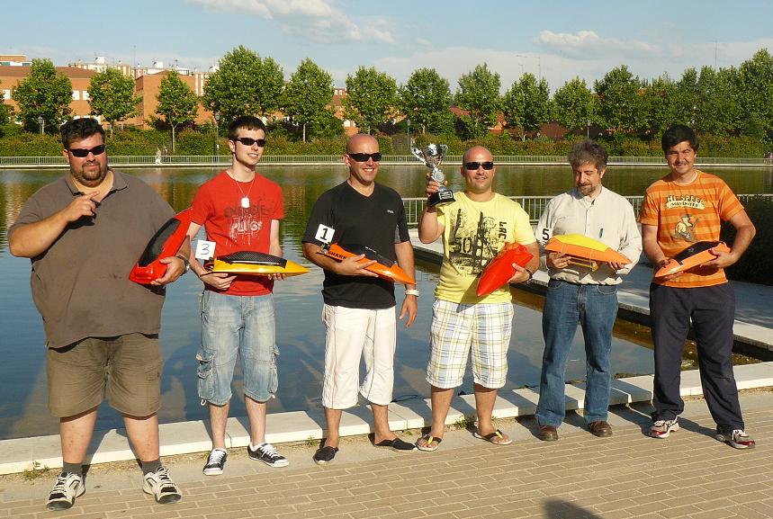 Nos dió tiempo a correr 5 mangas de Eco-SHARK con 7 lanchas, y descartar cada uno su peor resultado. Eso nos vino bien, porque en la primera todo eran nervios (mi lancha salía directamente del taller, le monté entera en esa semana) y fué la que descartamos casi todos. La suma del nº de vueltas de las otras 4 mangas daba directamente el Campeón. Un par de chubasquillos no dieron problema ninguno, gracias a la inmensa carpa metálica del Lago de Fuenlabrada. Tuvimos tiempo de charlar en boxes, echar un par de mangas con las ECO grandes y disfrutar con los demás modelos que habían llevado los compañeros para disfrutar de la jornada naval. Buen ambiente, sillas para todo el mundo, cervecitas entre mucho hielo, bocatas a 2 euritos,