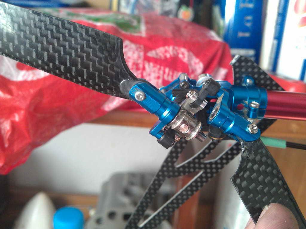 Despues al arrancarlo se me salia una de los soportes de las palas del rotor de cola de su eje, debido a la fuerza centrífuga. Lo probé sujetándolo con la mano el alto, y menos mal, de lo contrario se habria llevado otro piñazo. Descubri quetando la pala, que el portapalas se sujeta al eje a traves de un tornillo que se habia desenroscado, por lo que la solucion fue facil, aplicando fijatornillos.