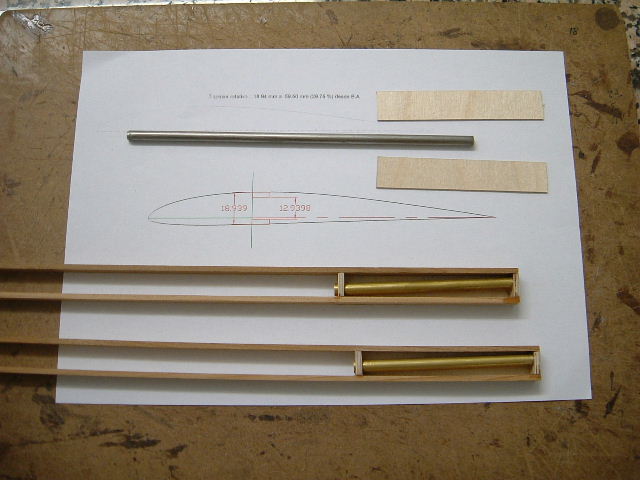 Alas cortadas en foam, enchapadas en limoncillo, sapeli o similar. Largueros en pino y carbono. Borde de fuga en carbono, refuerzos puntuales en fibra de vidrio.